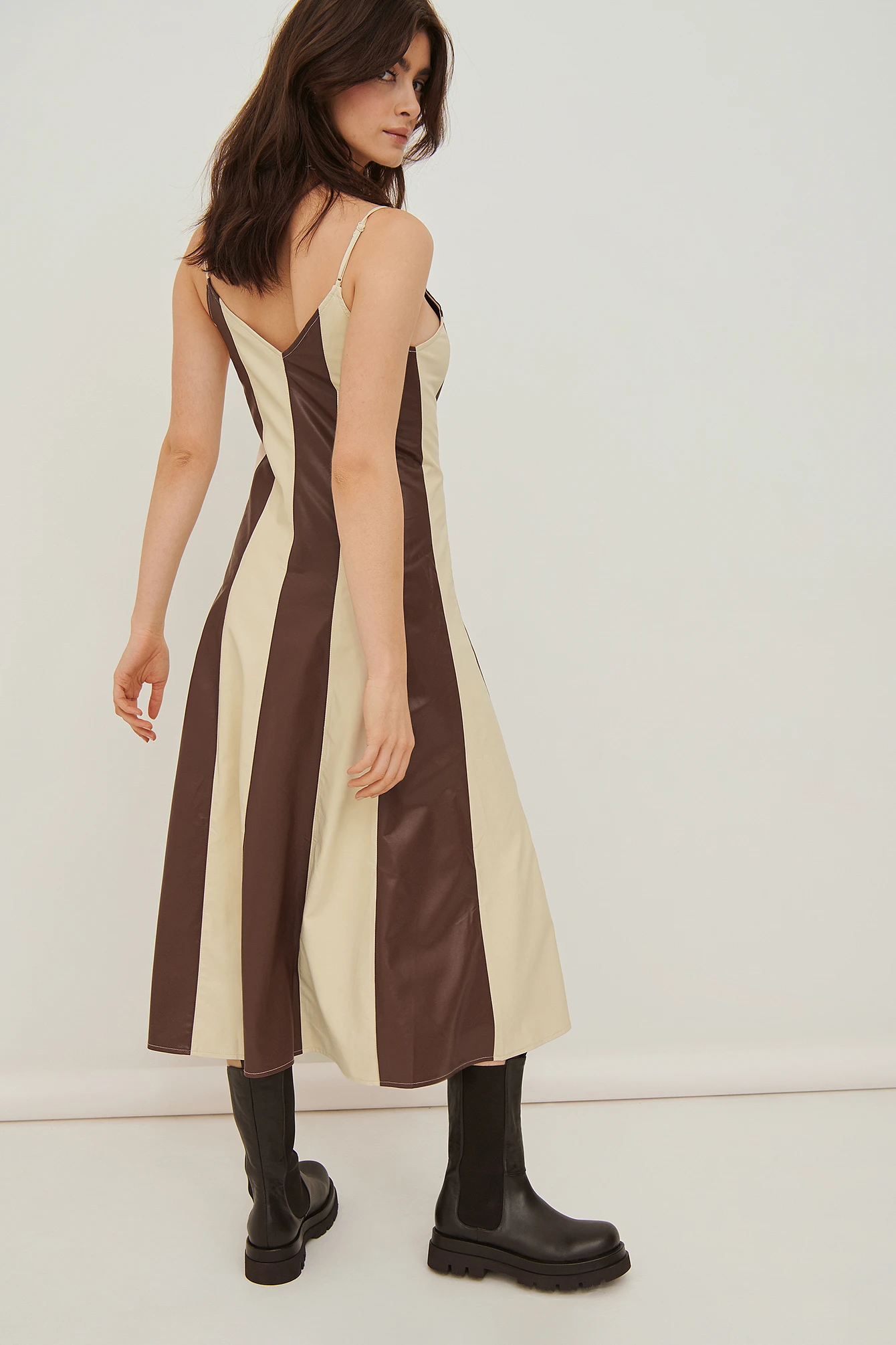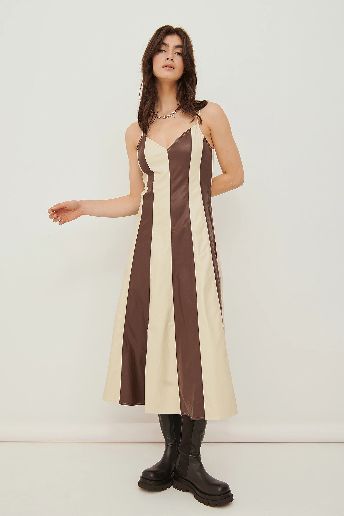 Cette robe midi a un col en V, des bretelles fines, un motif à couleurs contrastées, une matière en similicuir et une coupe fluide.