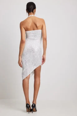 Cette robe midi est tricotĂ©e, moulante et faite en lurex et a des manches longues avec dĂ©tail froncĂ© sur l’ourlet bas et un col en V.