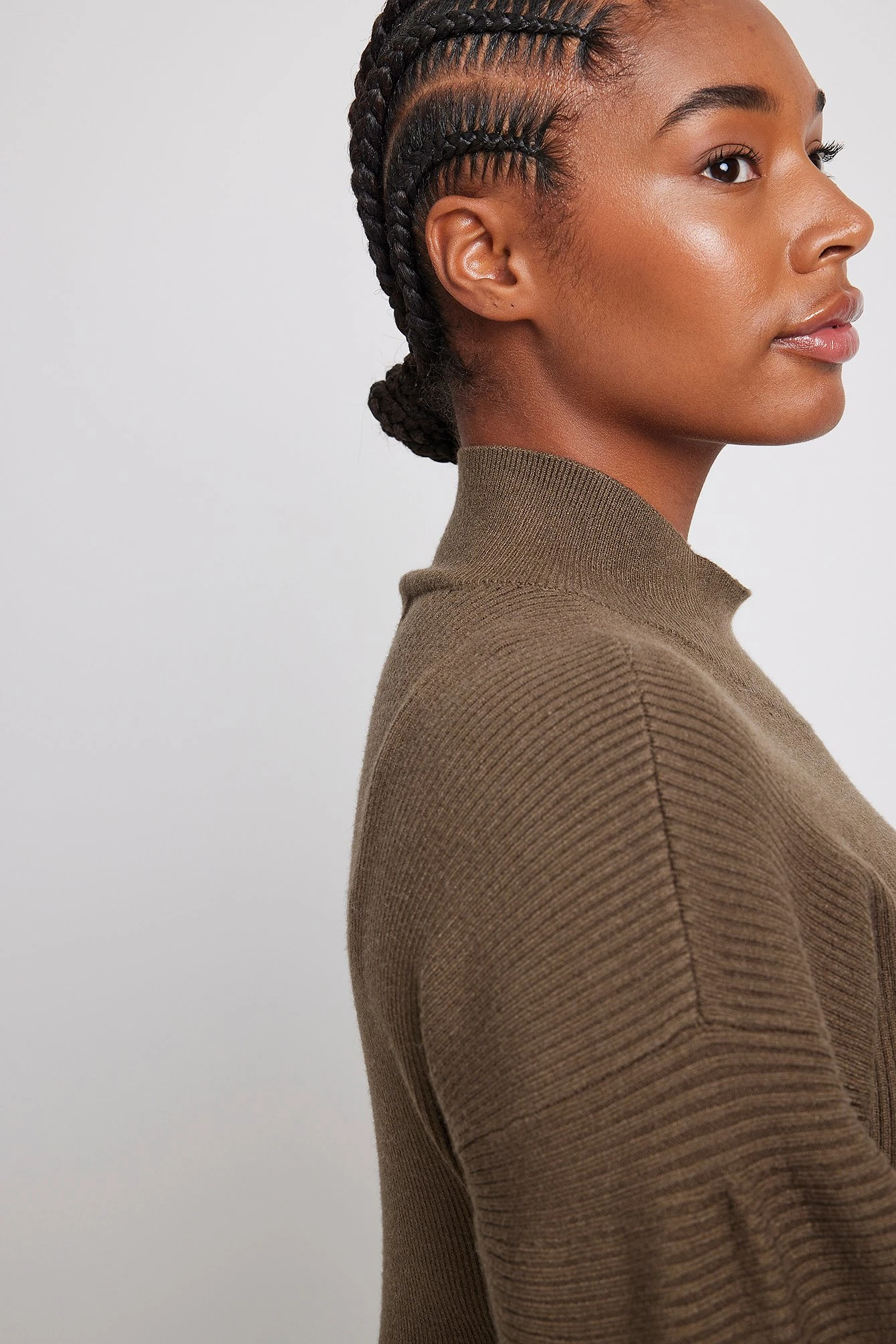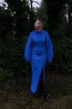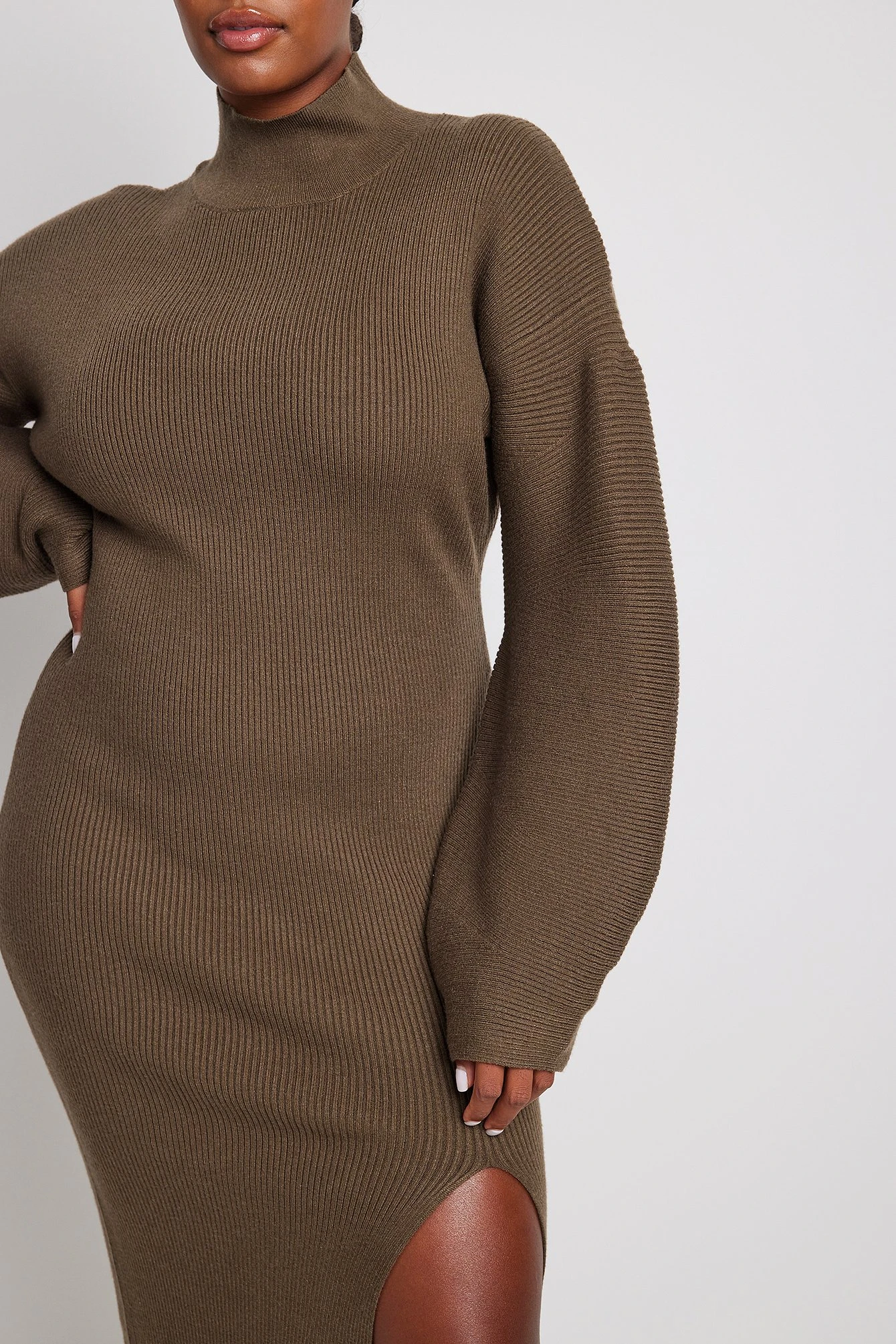 Cette robe a un col haut. Elle a des épaules tombantes et des longues manches larges. Cette robe a une taille midi avec fente latérale.