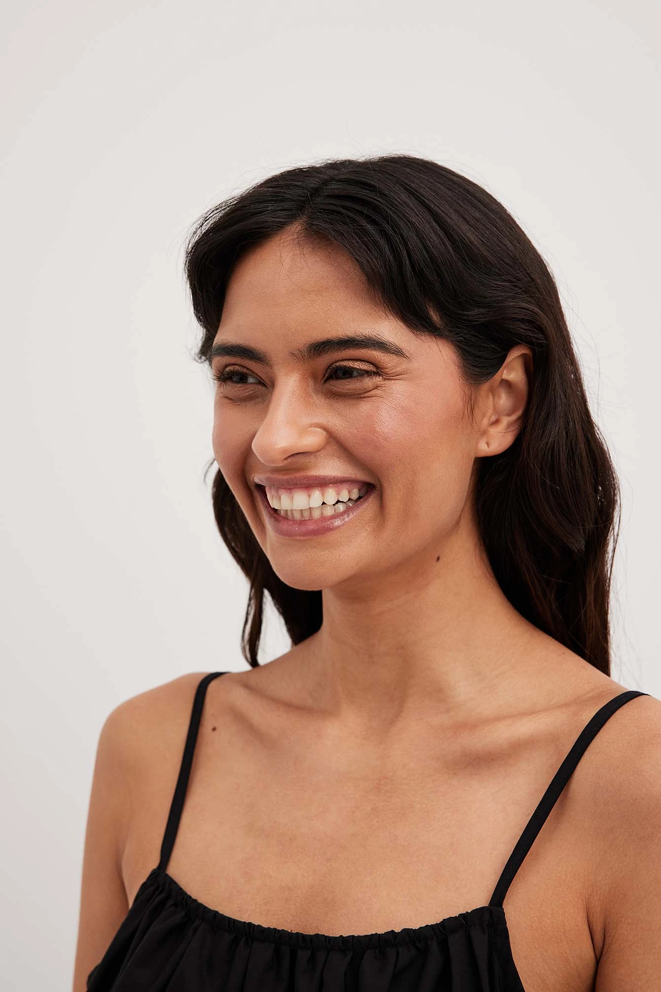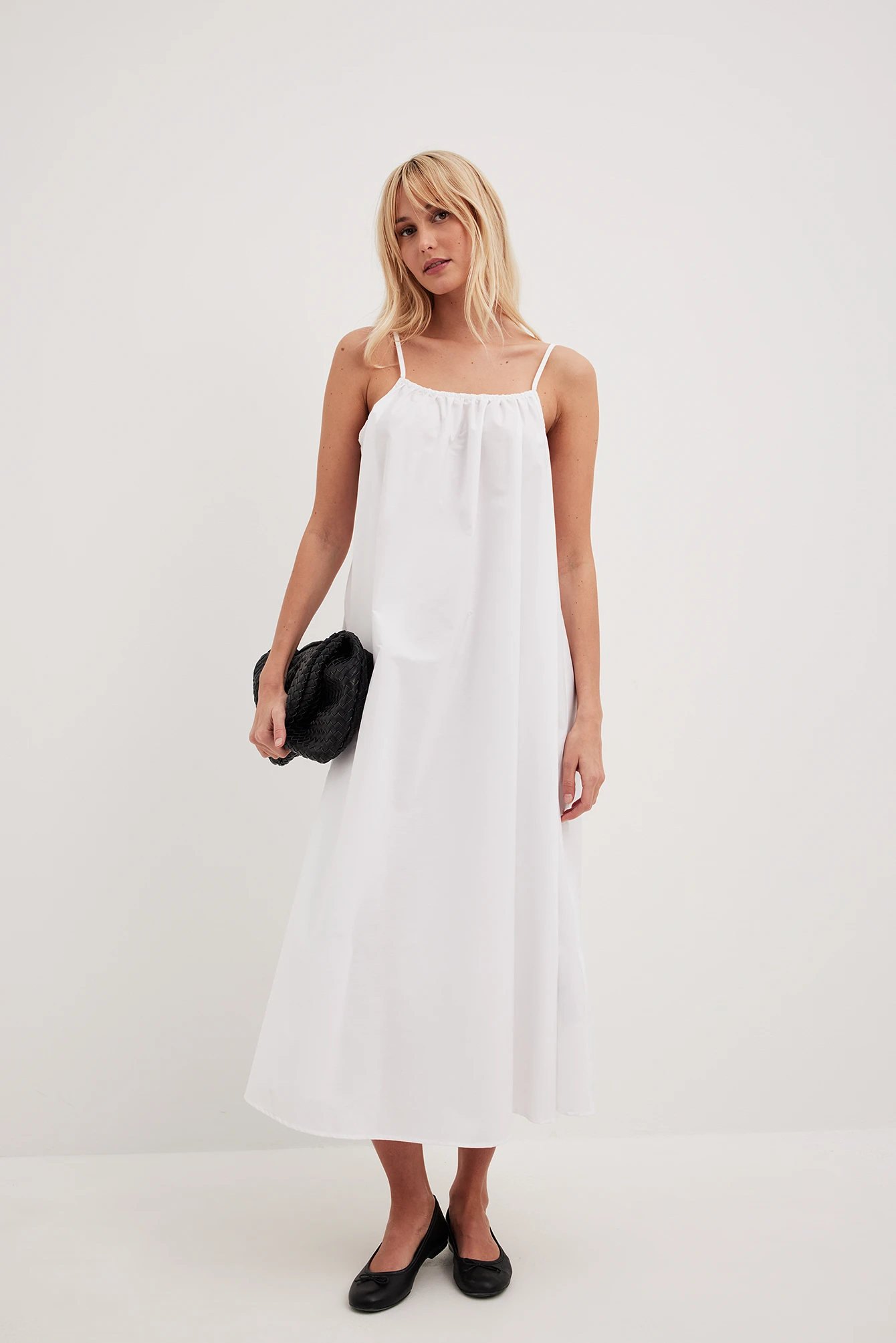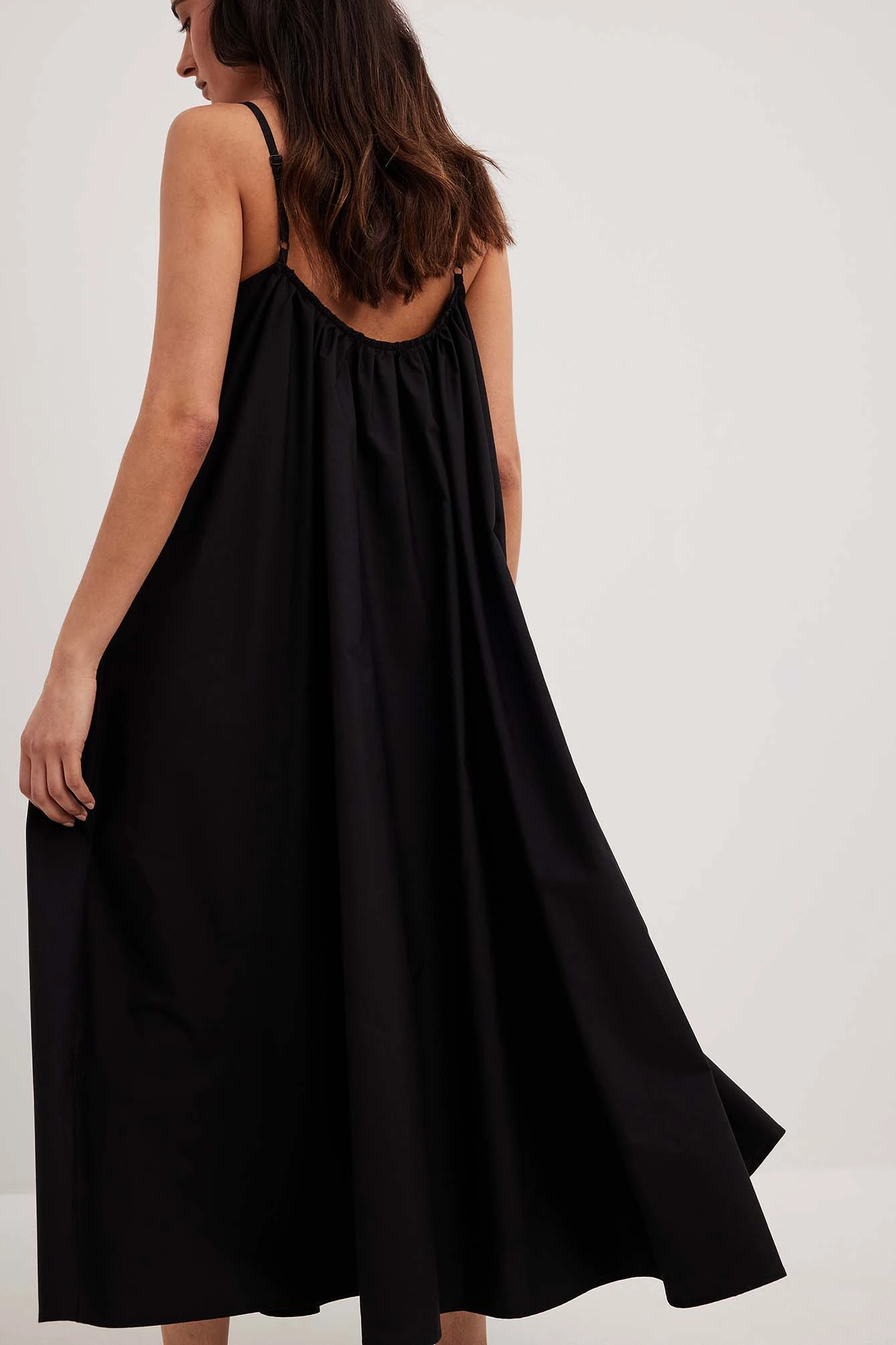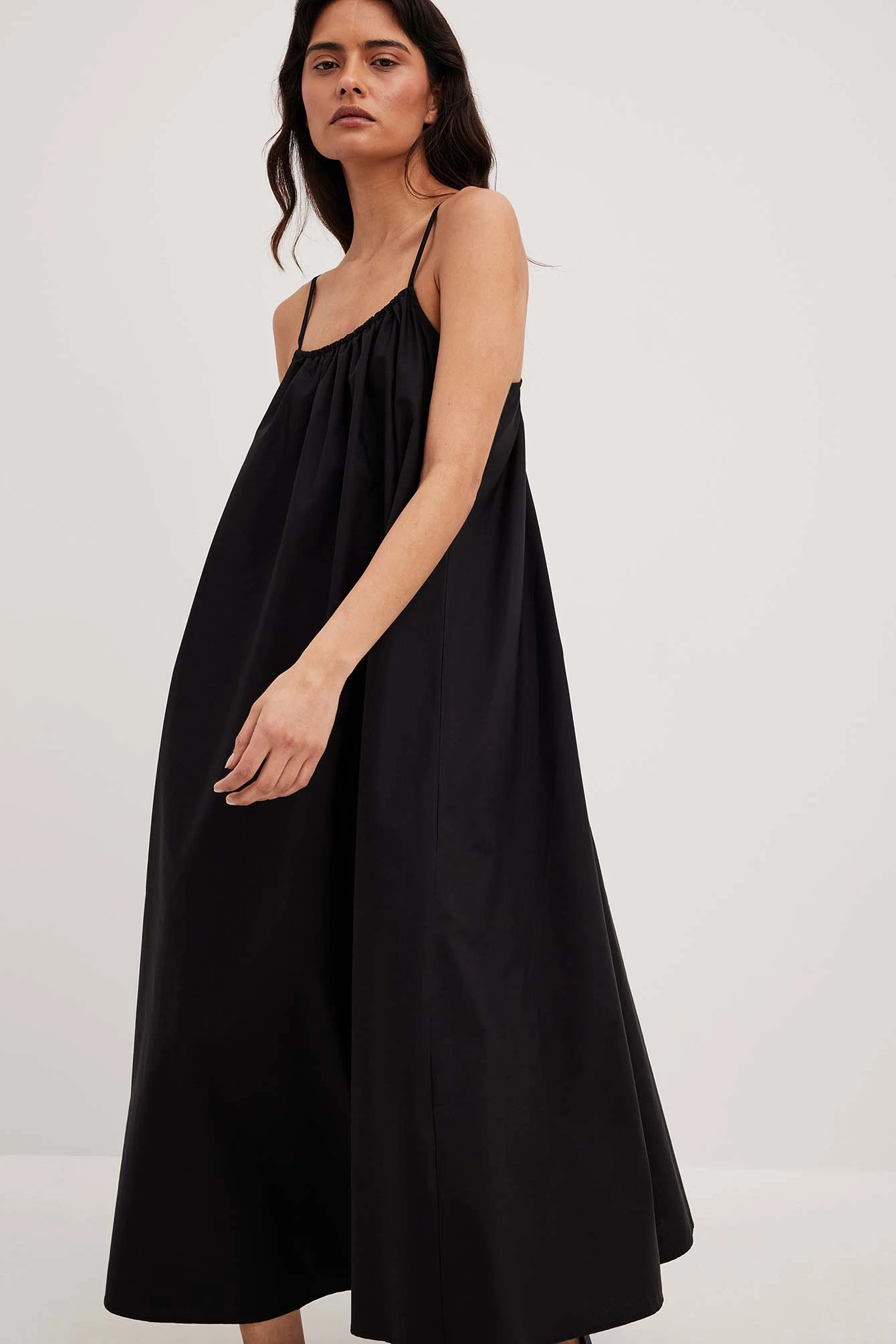 Cette robe est large et a une taille midi. Elle a une encolure droite et des bretelles fines réglables et non amovibles.
