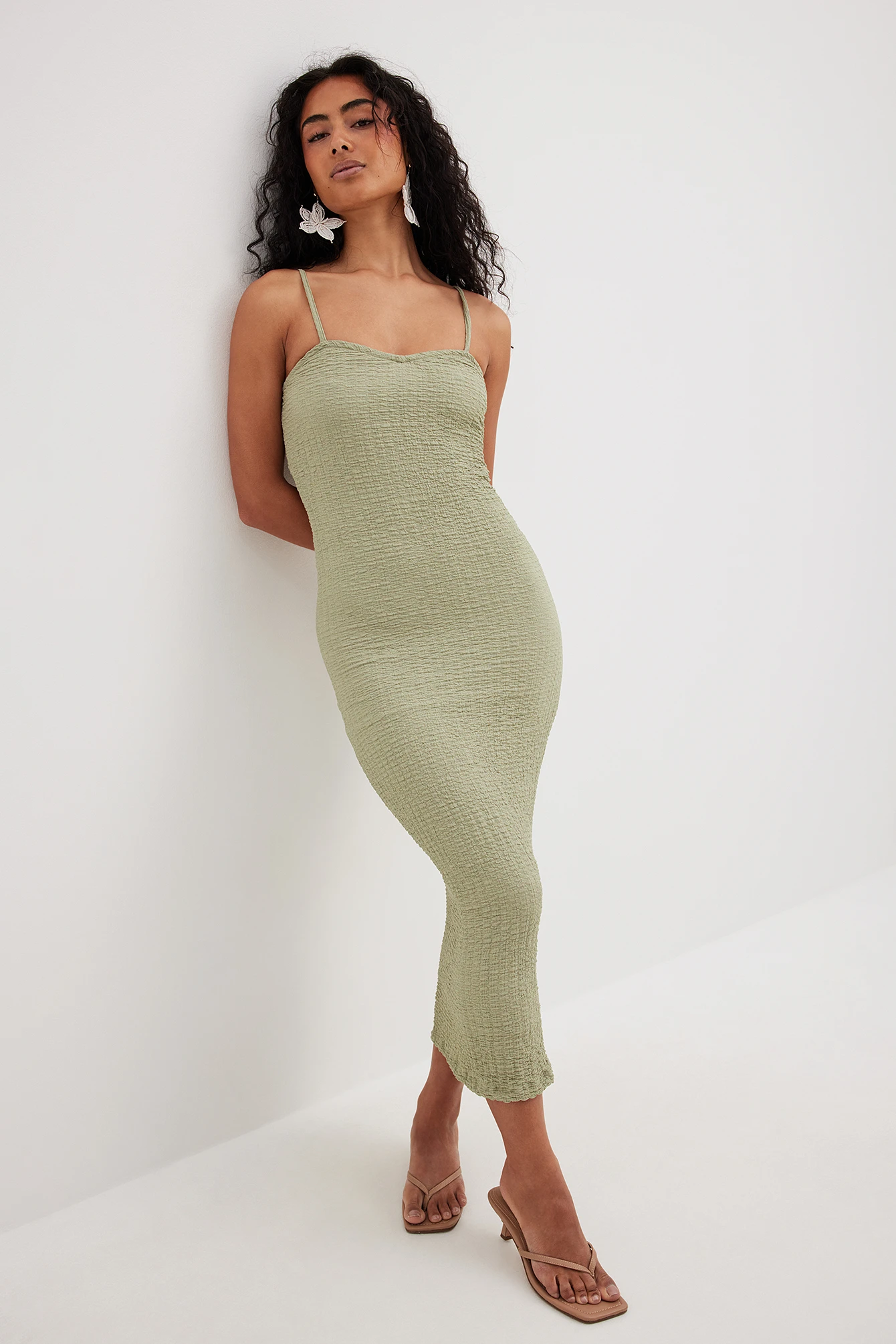 Cette robe midi a une coupe moulante. Elle a des bretelles fines et une garniture intérieure en silicone. Cette robe midi a une matière élastique et une doublure.