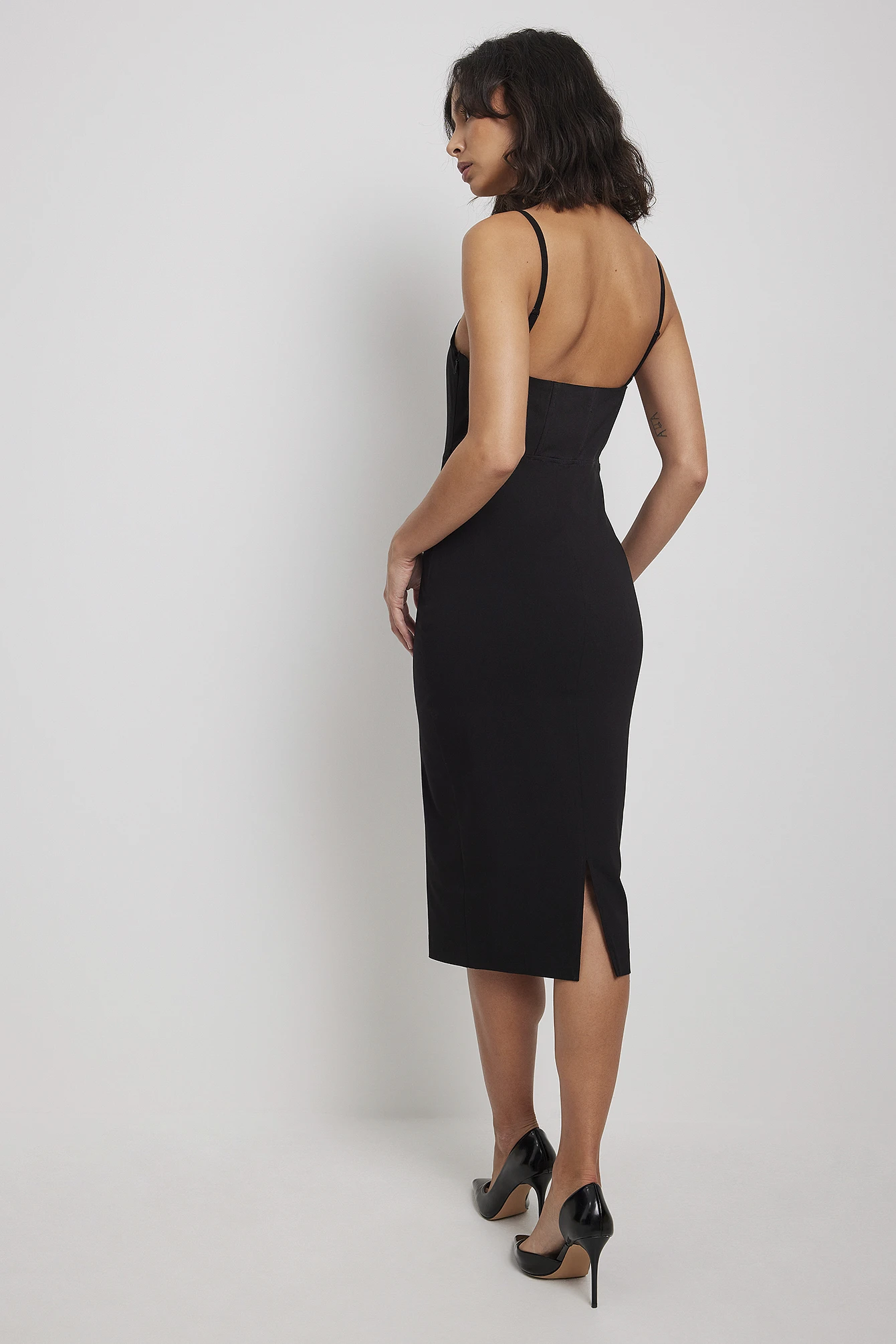 Cette robe midi est élastique et a des bretelles réglables, un détail corset avec armature, une fermeture éclair latérale cachée et un détail fendu à l’arrière.