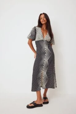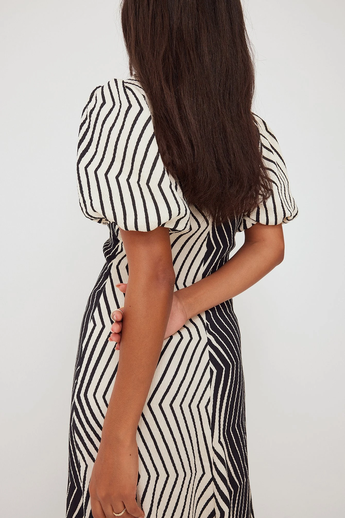 Cette robe midi est col en v et élégante et a des manches bouffantes et une matière texturée.