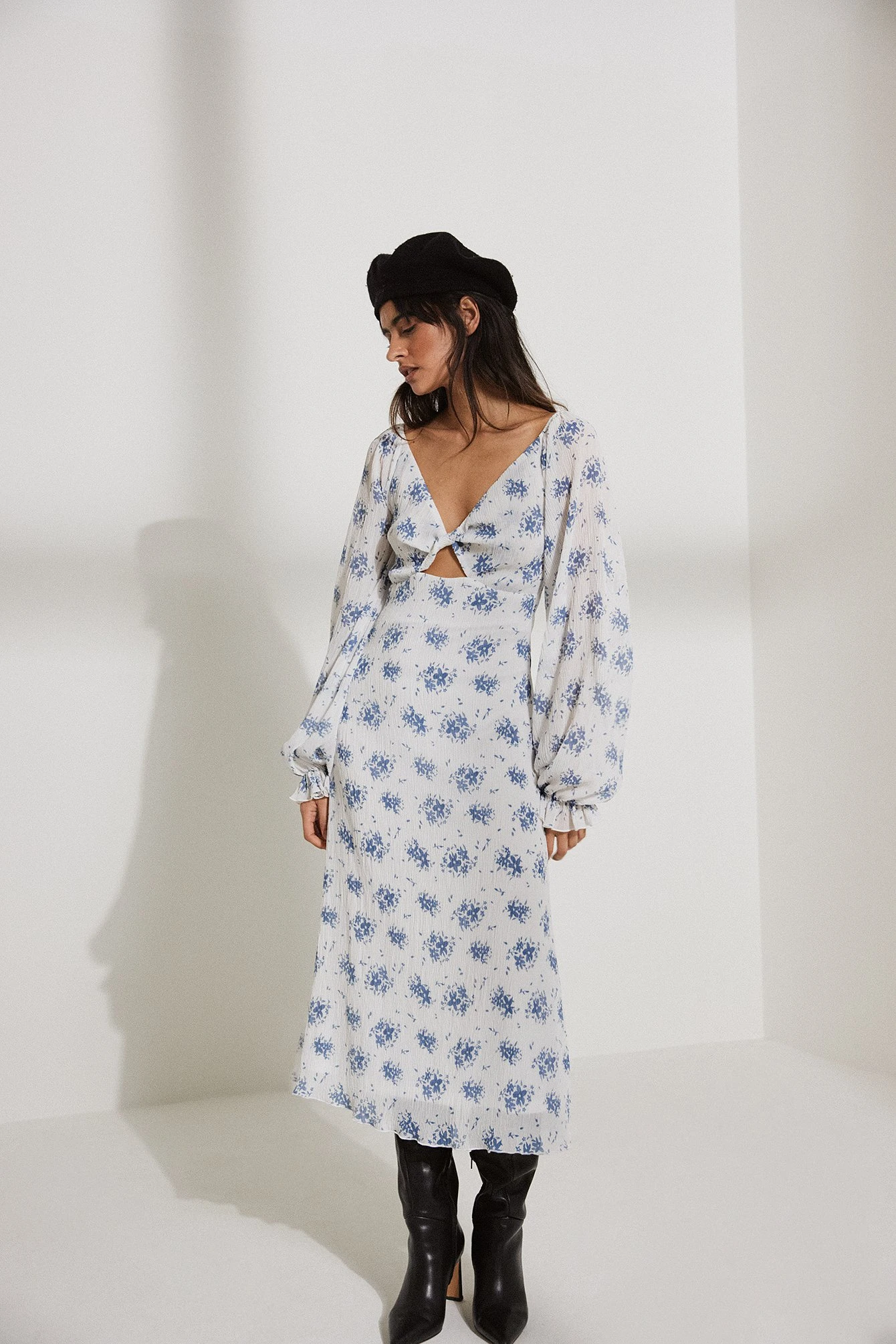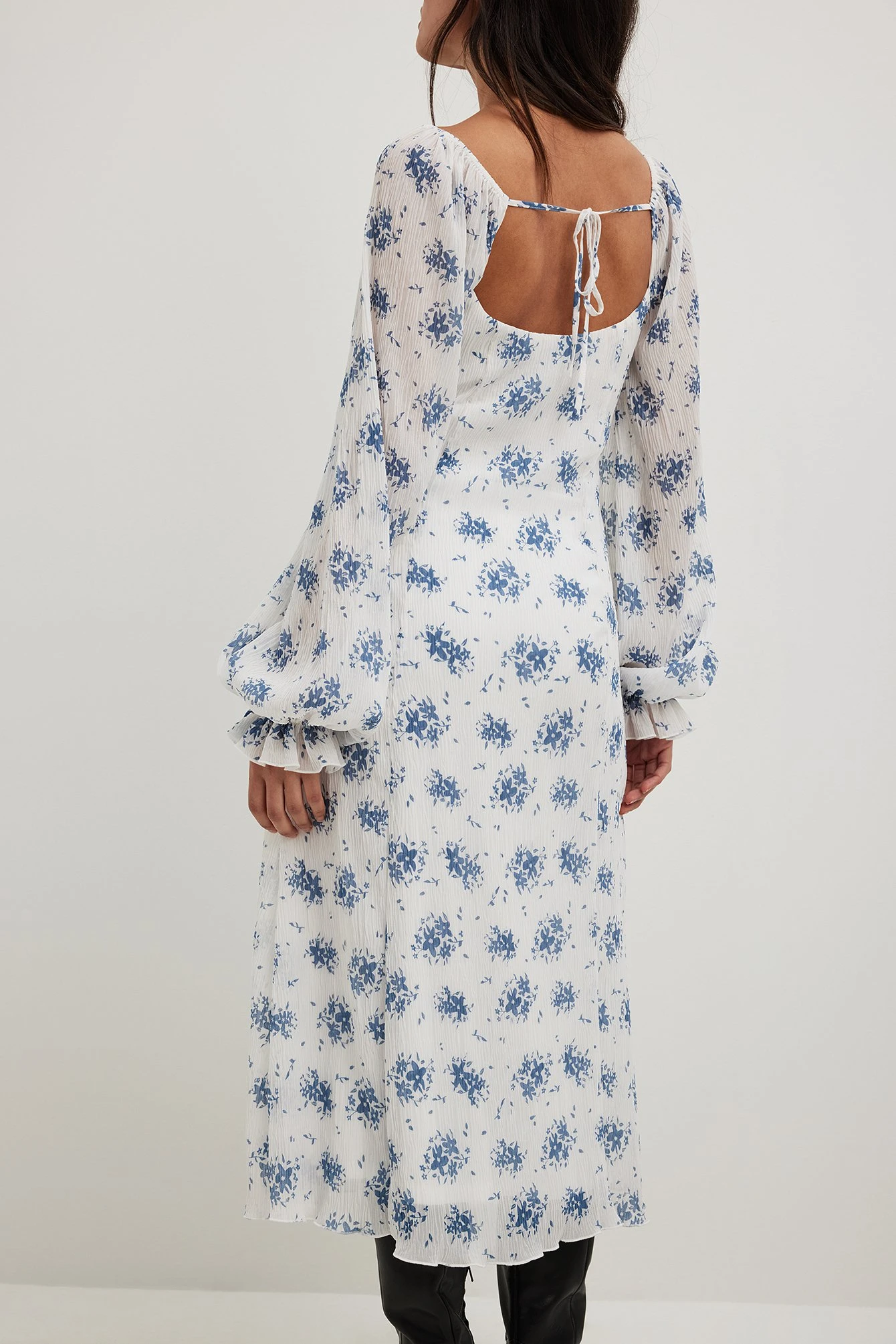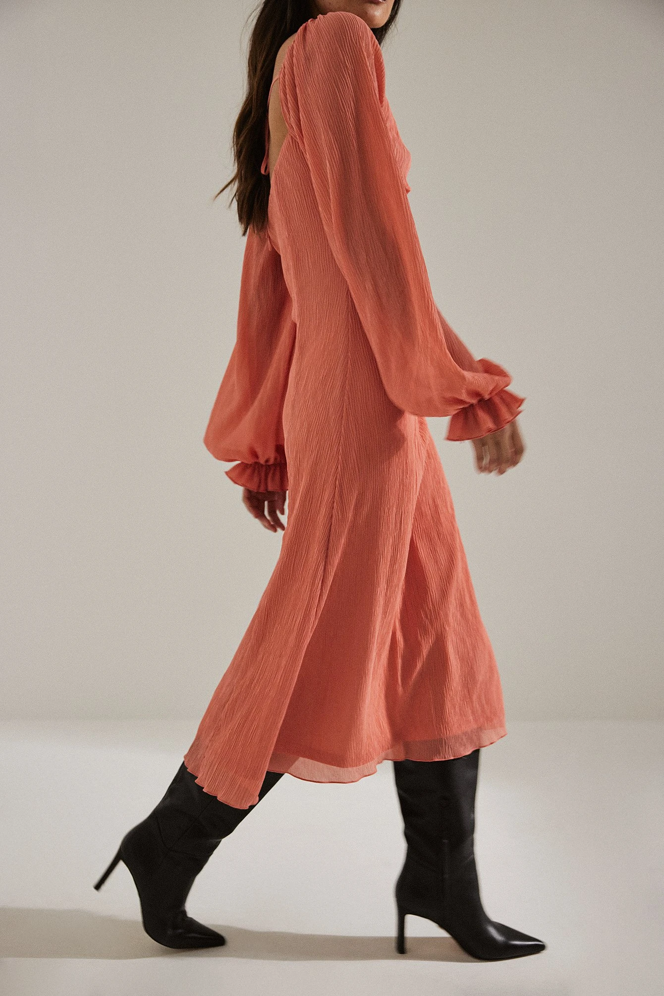 Cette robe midi a une coupe fluide. Elle a un col en V avec découpage torsadé et un design à dos ouvert avec détail auto-sérré. Cette robe midi a une longue manche ballon.