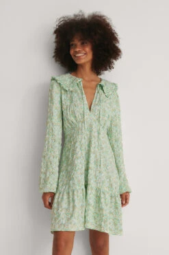 Cette robe a un col à volants, un col en V avec bandes, des détails de couture à la taille, des manches longues, une taille courte et une matière rigide.