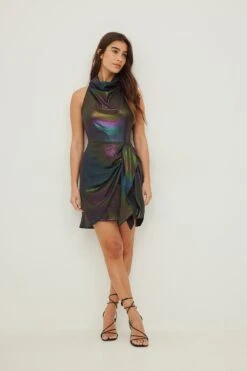 Cette robe a une encolure drapée et haute, un bouton de fermeture à l’arrière de la nuque, un design sans manches, une fermeture éclair à l’arrière, un détail noué à la taille et une taille courte.