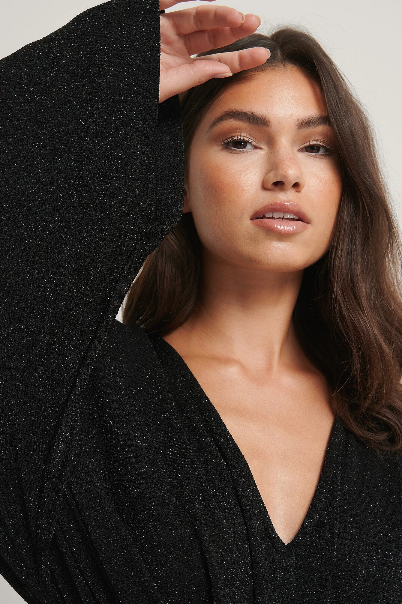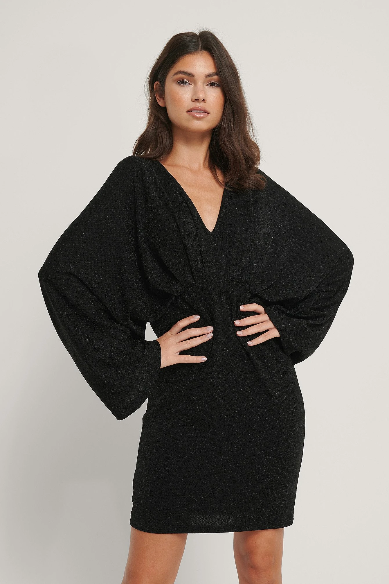 Cette robe est brillante et idéale pour une soirée et a un col en V, des longues manches chauve-souris, une ceinture élastique, des détails plissés sur la moitié haute, une doublure intérieure et une taille courte. Grande taille.