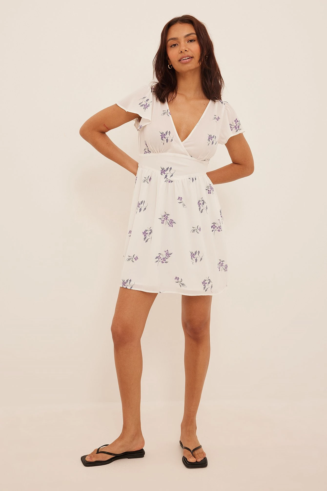 Cette robe courte a des manches courtes, un col en V et une doublure à l’intérieur.