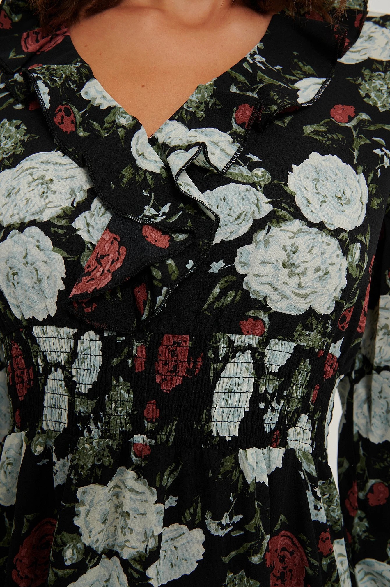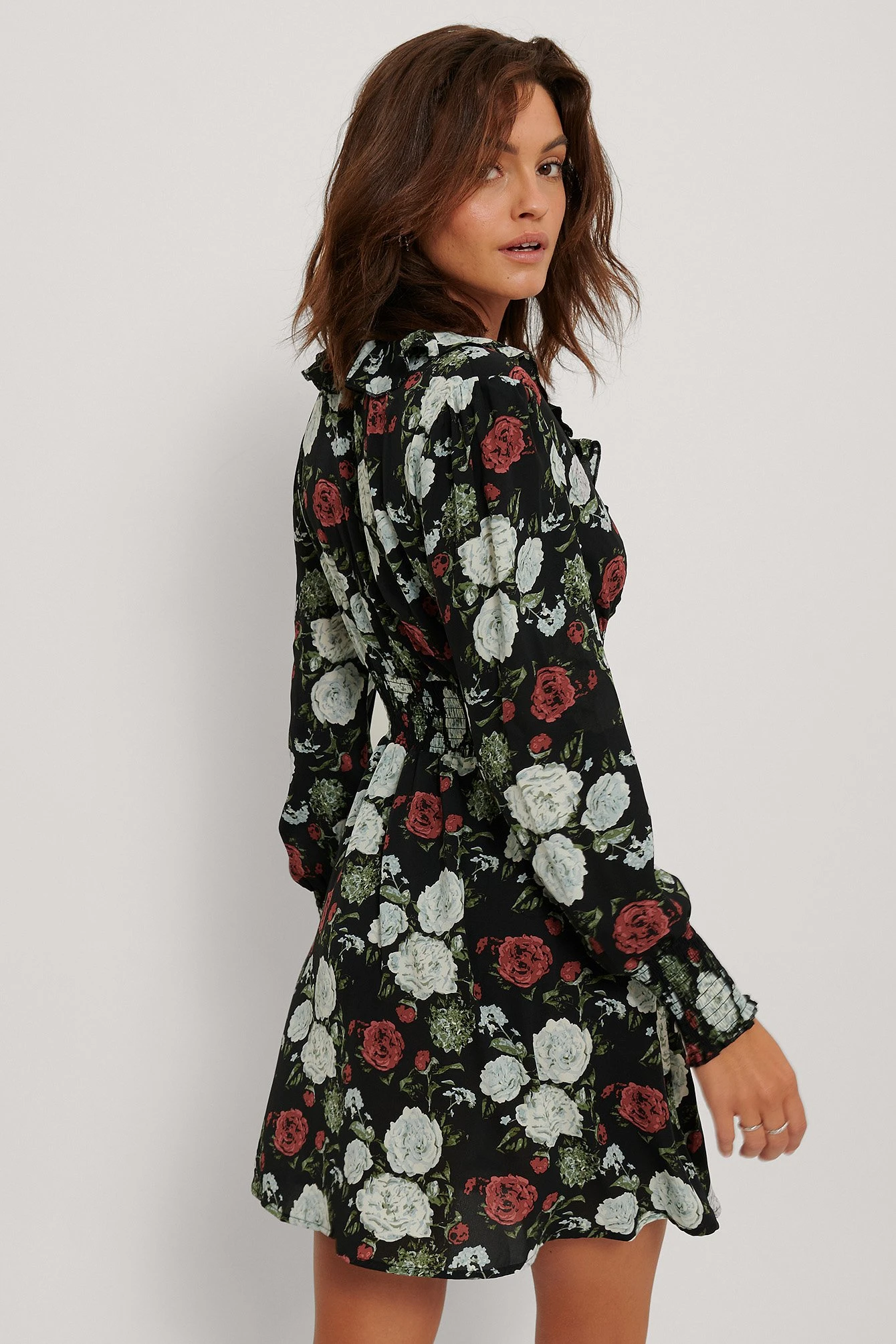 Cette robe a un col en V froncé, des manches longues, un design avec détail froncé à la taille et sur les manchettes, une coupe fluide et une taille courte.