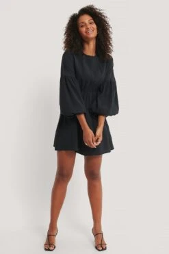 Cette robe a un col arrondi, une fermeture éclair à l’arrière, des manches ballon longues et tombantes avec manchettes élastiques, une ceinture élastique, une coupe fluide, du toucher doux et une taille courte.