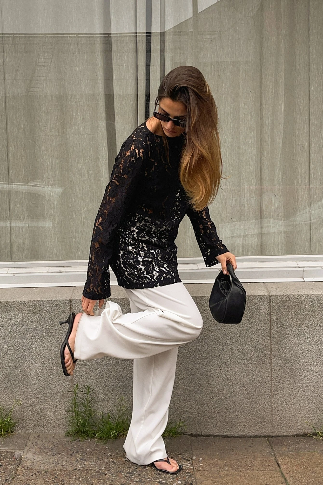 Cette robe courte a un col arrondi, des manches longues et une matière en dentelle transparente et douce.