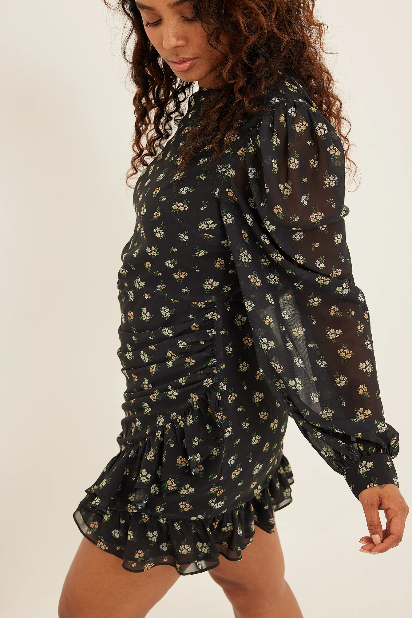 Cette robe courte a un col arrondi, des manches ballon en maille avec épaules bouffantes, des boutons de manchette sur le côté, un détail drapé à l’avant, des volants sur l’ourlet, une fermeture au dos avec crochet et oeillet, une taille marquée et une doublure.