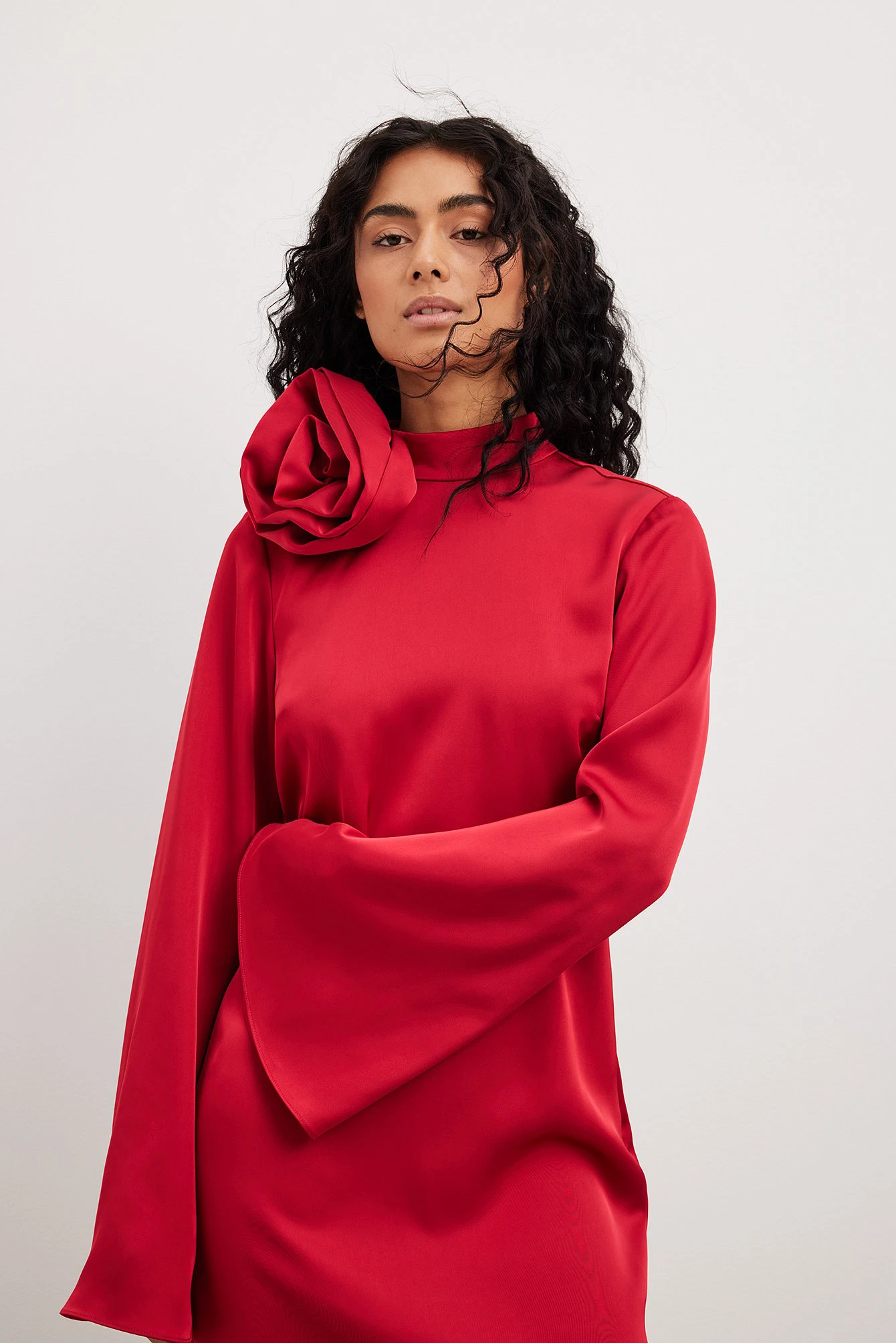 Cette robe courte a une coupe fluide. Elle a un toucher satin et un col haut avec bouton de fermeture. Cette robe courte a une longue manche large, un design à dos ouvert, une fermeture éclair latérale et un embellisement avec pince avec rose.