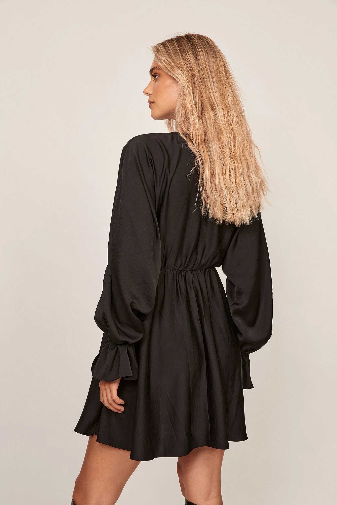 Cette robe courte est en satin et a un col en V, une ceinture plissée, des longues manches chauve-souris avec manchette élastique et froncée et une jupe fluide.