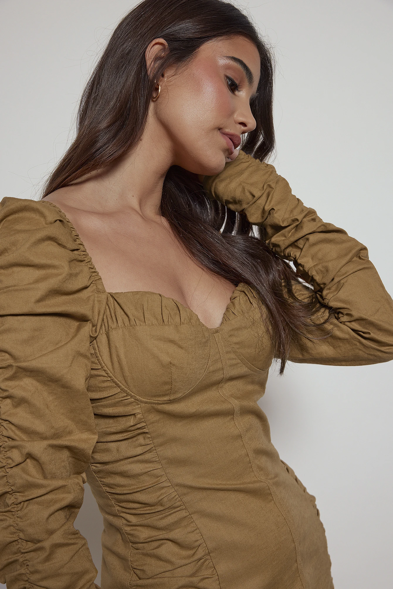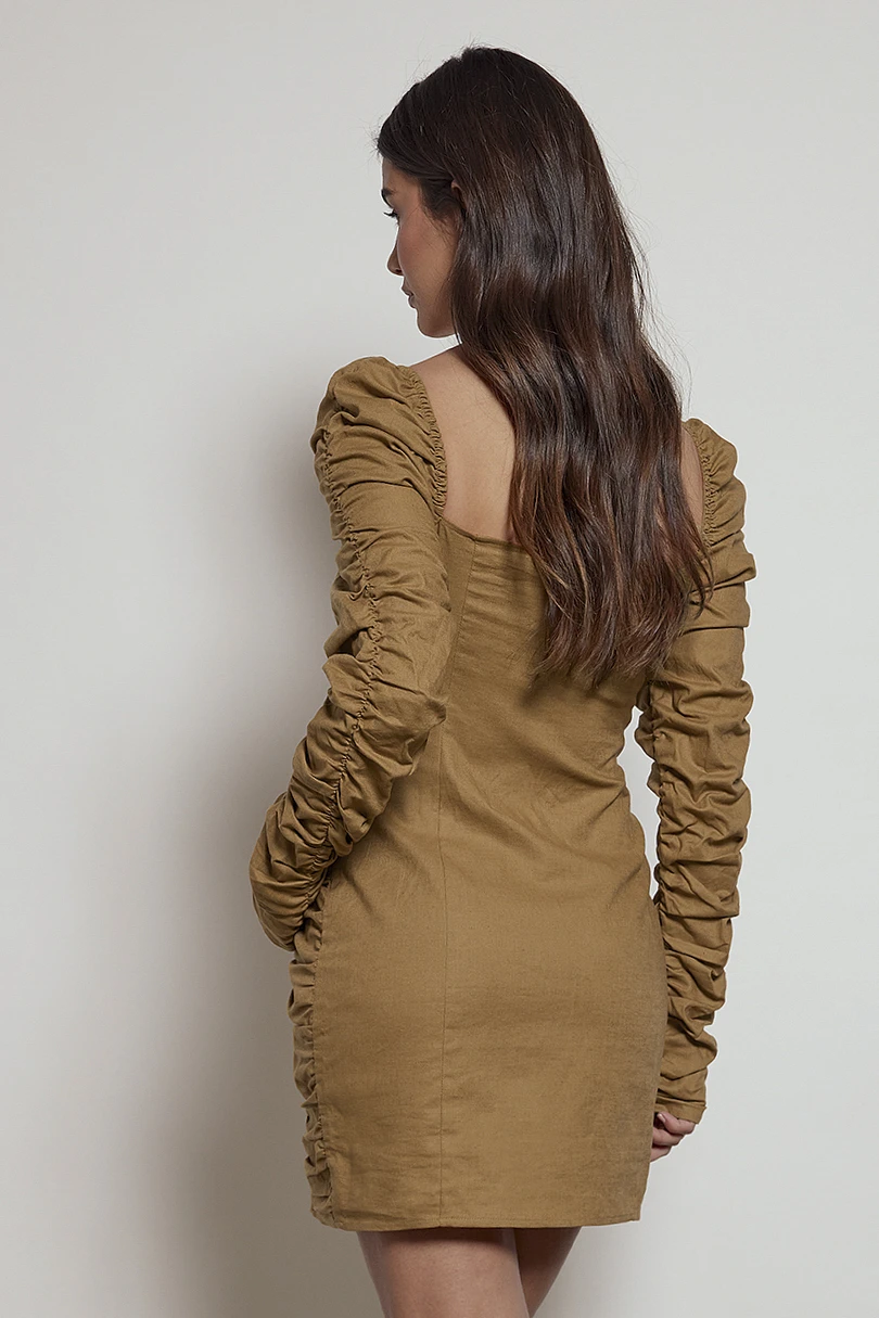 Cette robe courte a un décolleté en coeur avec détails de bonnet et des manches longues avec détails froncés.