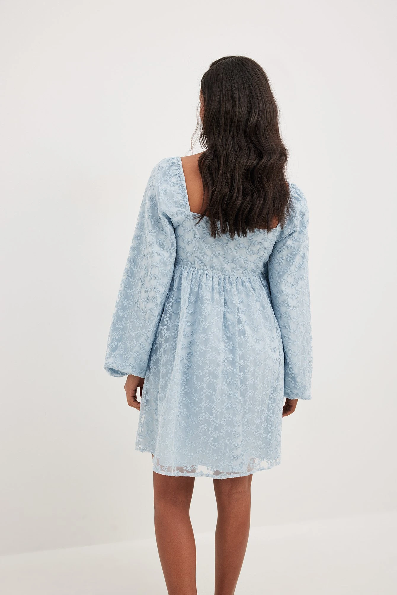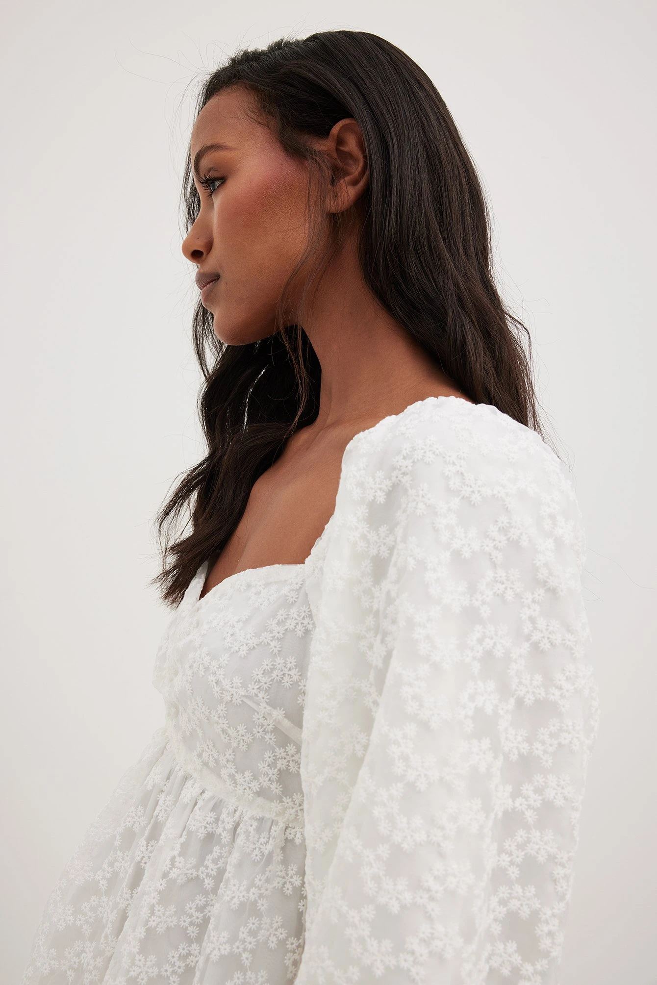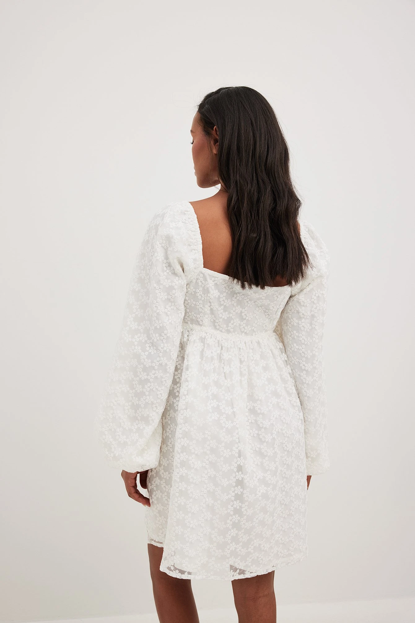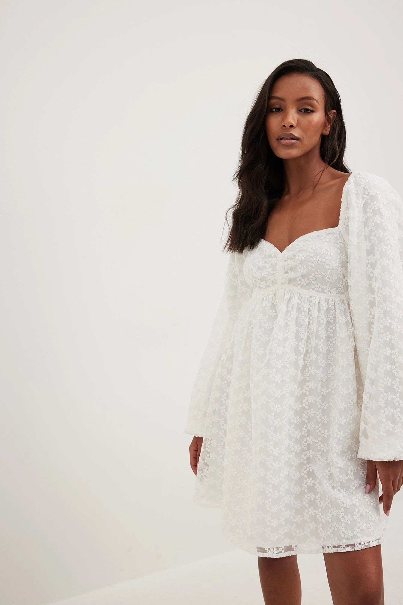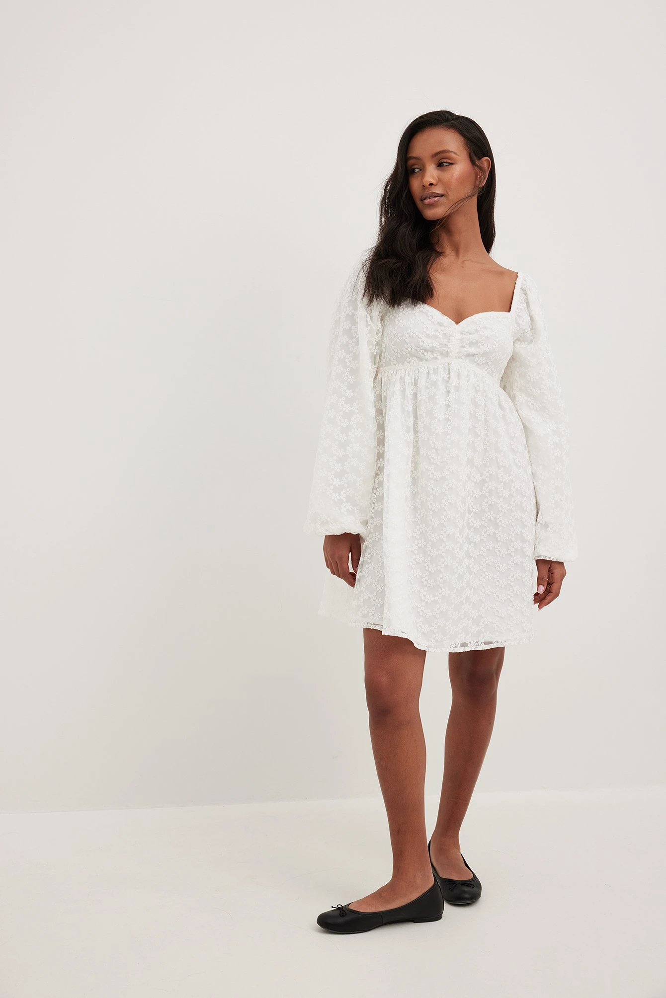 Cette robe courte a un décolleté en coeur avec détails froncés sur la poitrine. Elle a des manches longues bouffantes et une matière structurée.