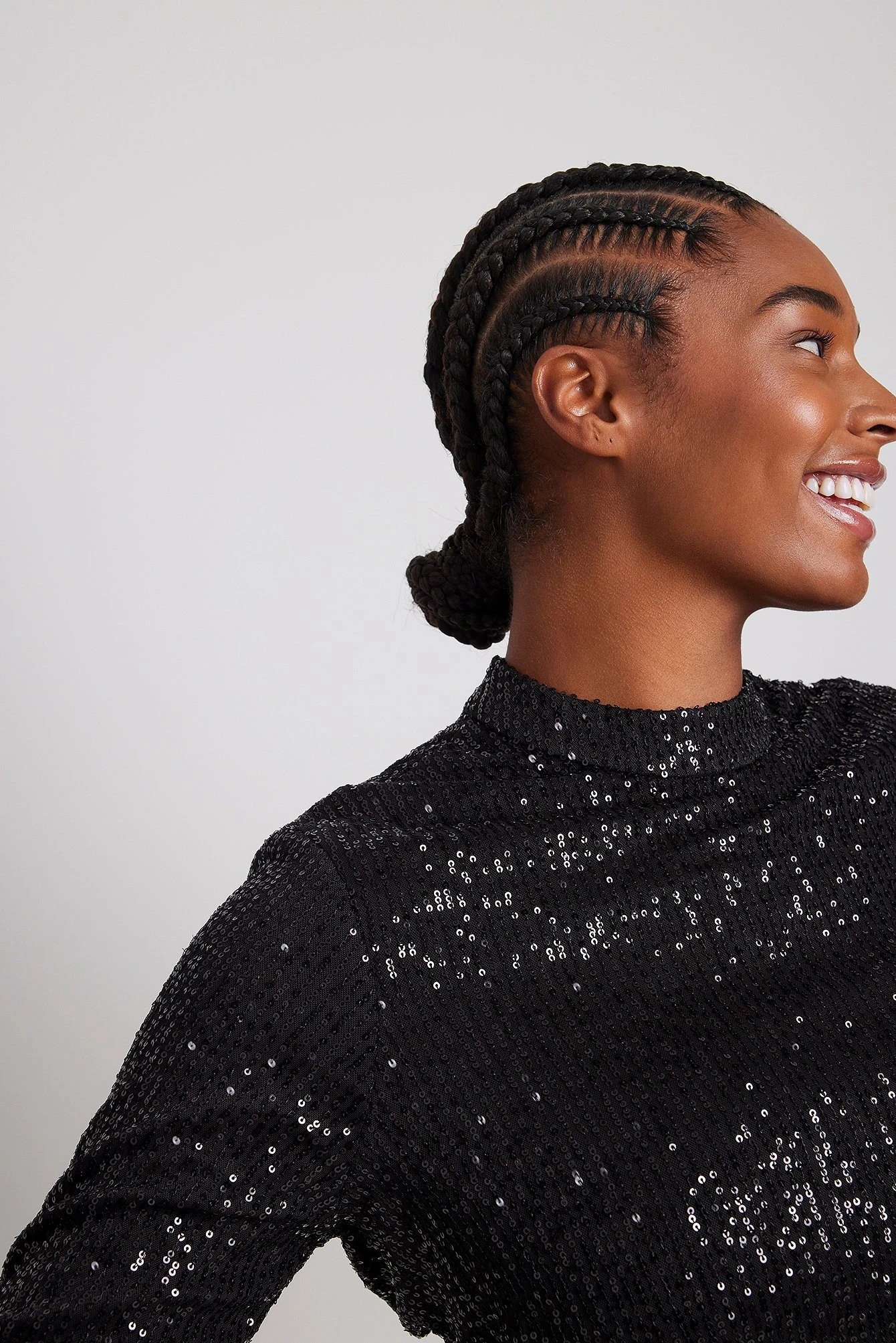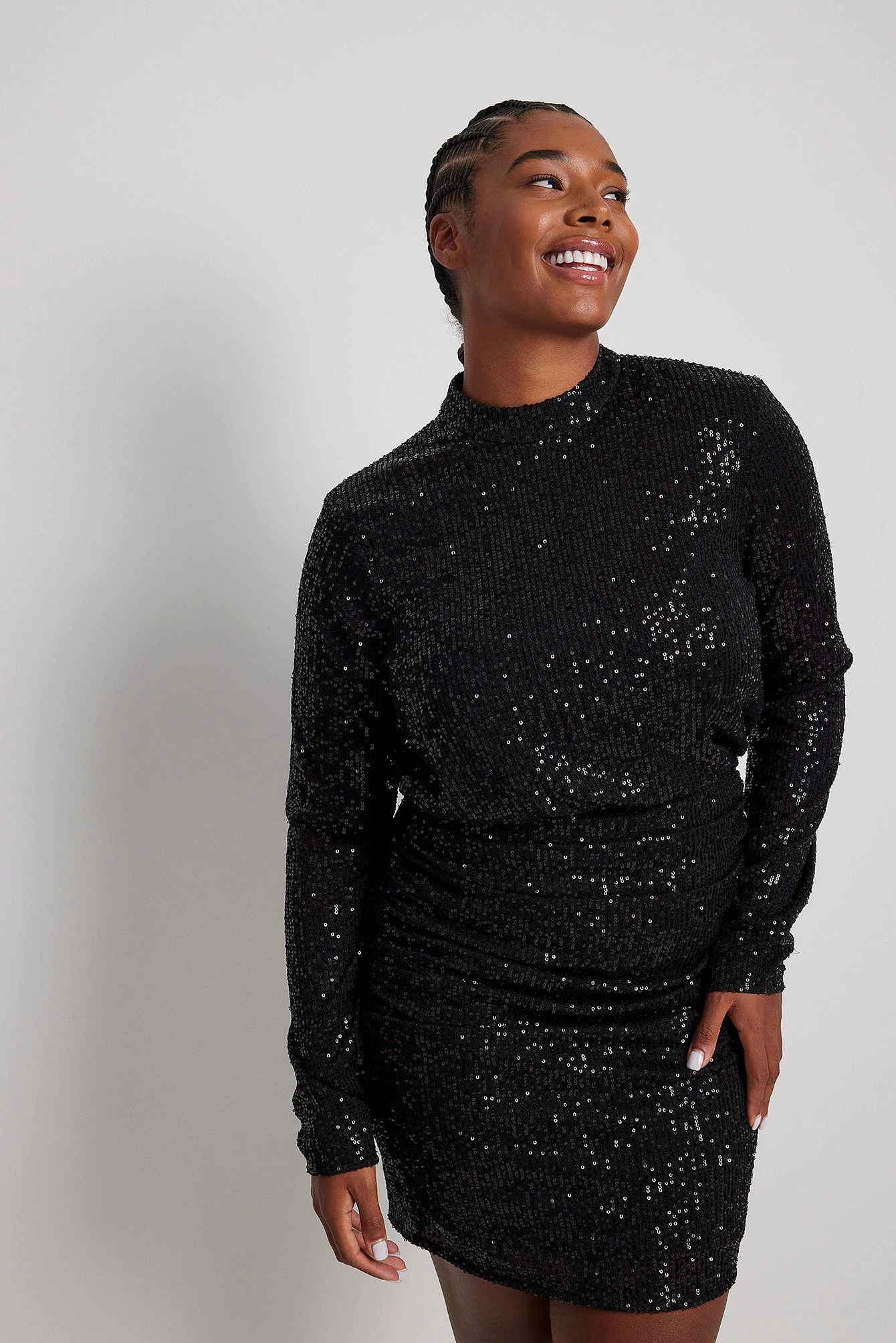 Cette robe courte a un col haut, des manches longues, une fermeture au dos cachée, des détails froncés sur les côtés et une matière sequin.