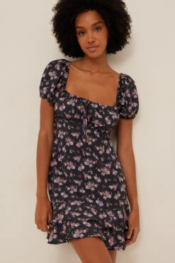 Cette robe courte a un col carré avec cordon avec noeud à nouer, des bonnets détaillés, des manches bouffantes courtes, une fermeture éclair à l’arrière, des détails à volants au bas et une coupe fluide.