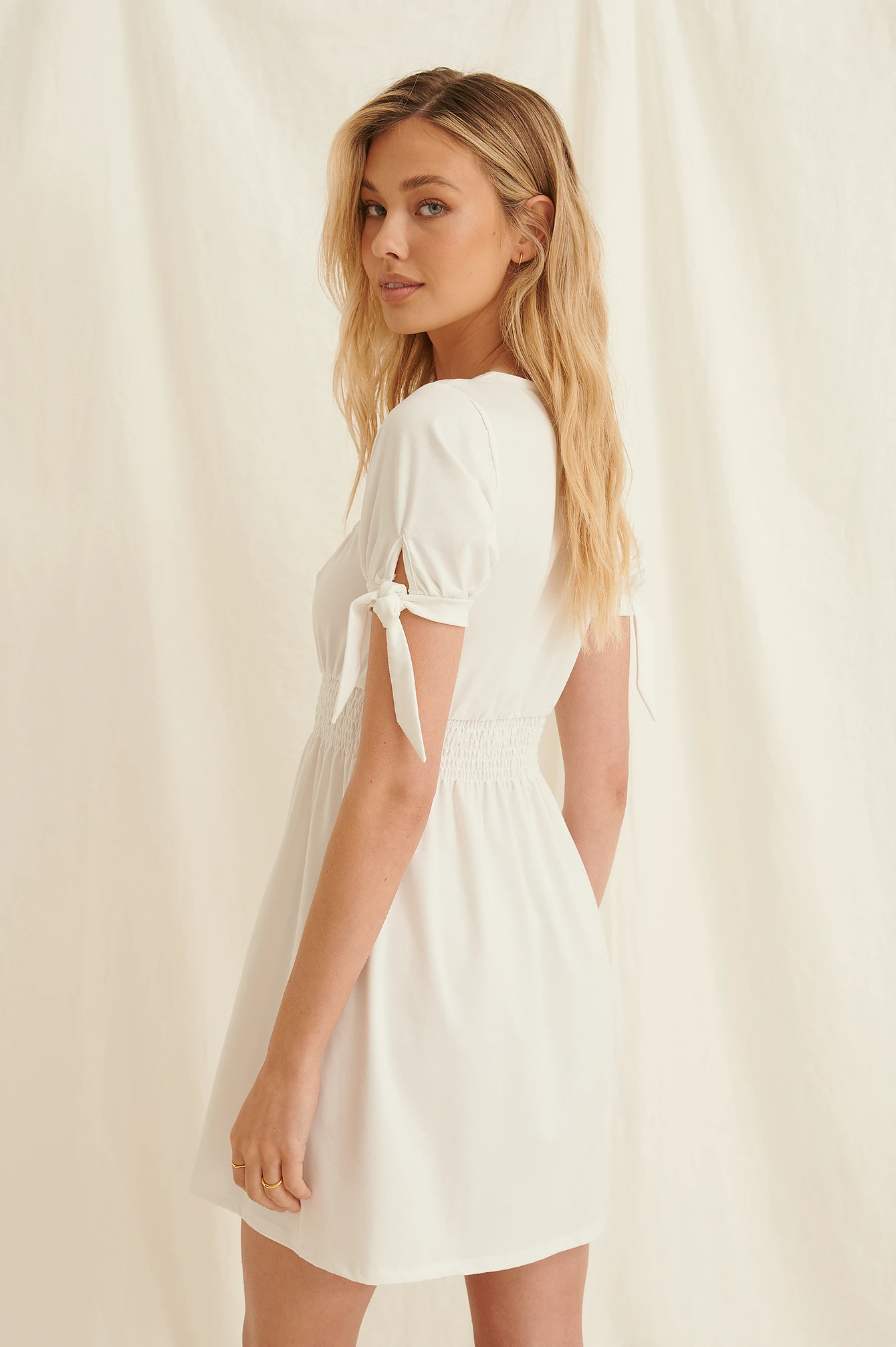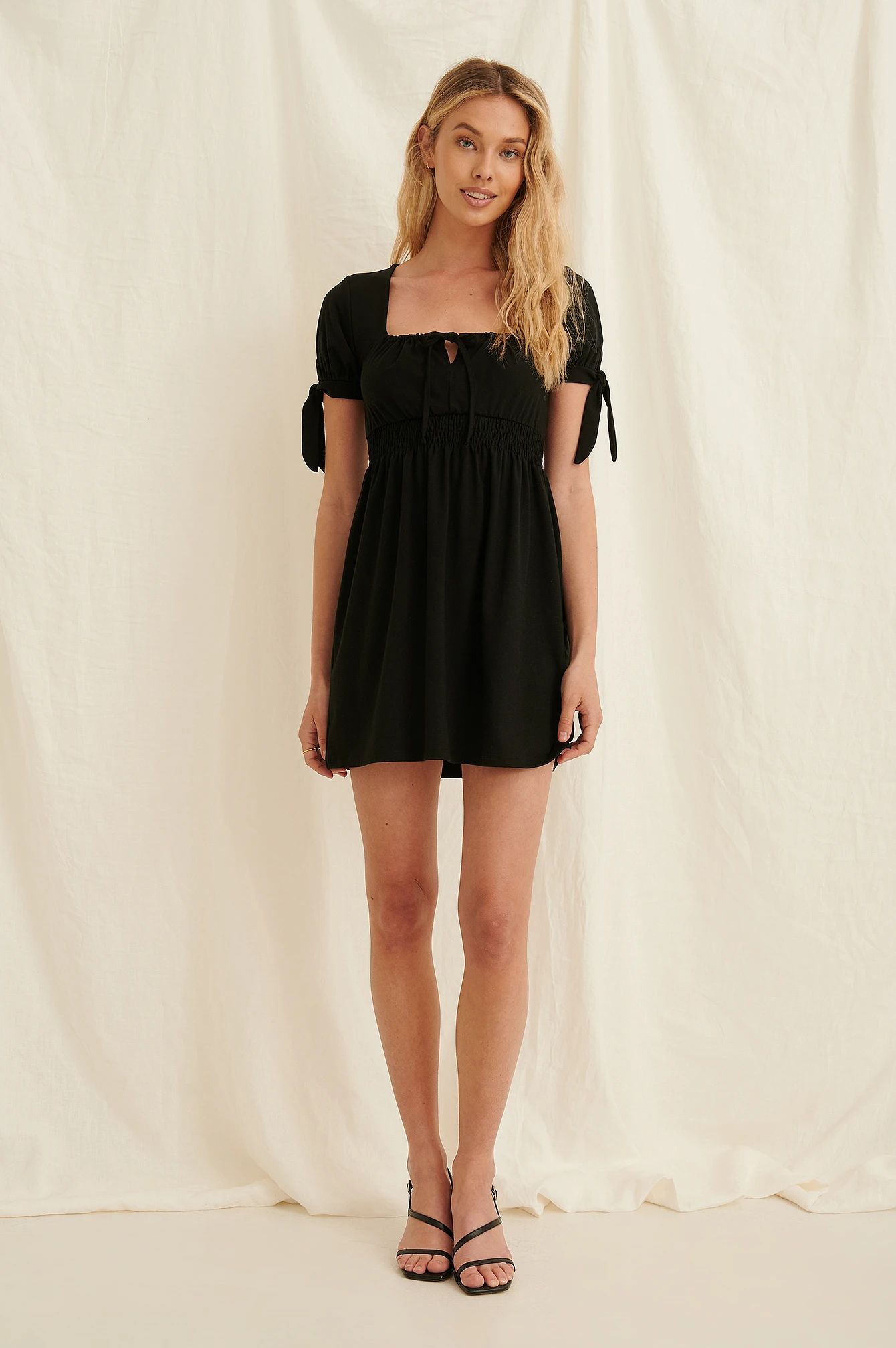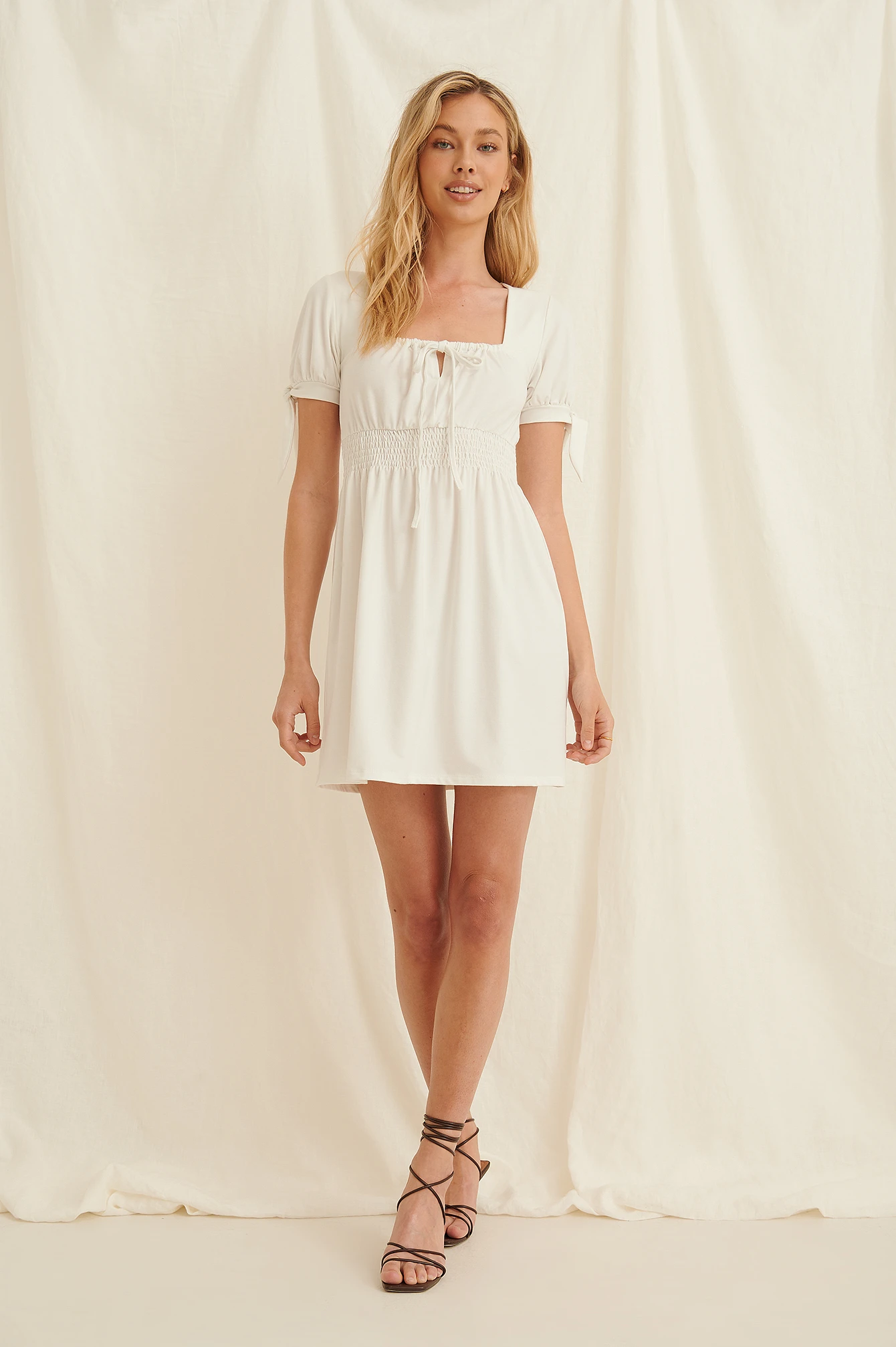 Cette robe a une encolure carrée avec détail à cordon coulissant avec ruban à nouer, des manches bouffantes à l’extrémité avec noeud, une ceinture froncée et élastique et une matière douce.