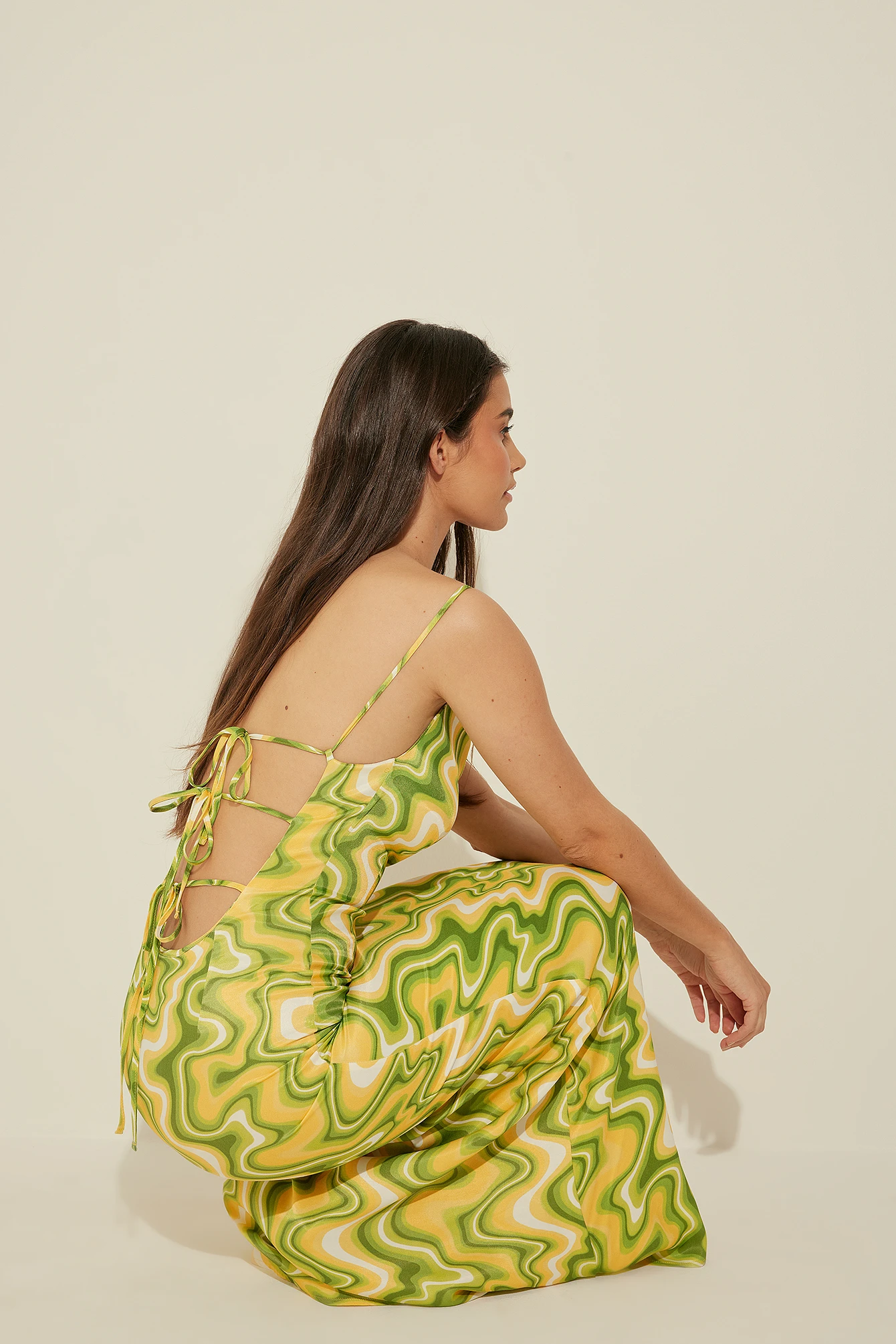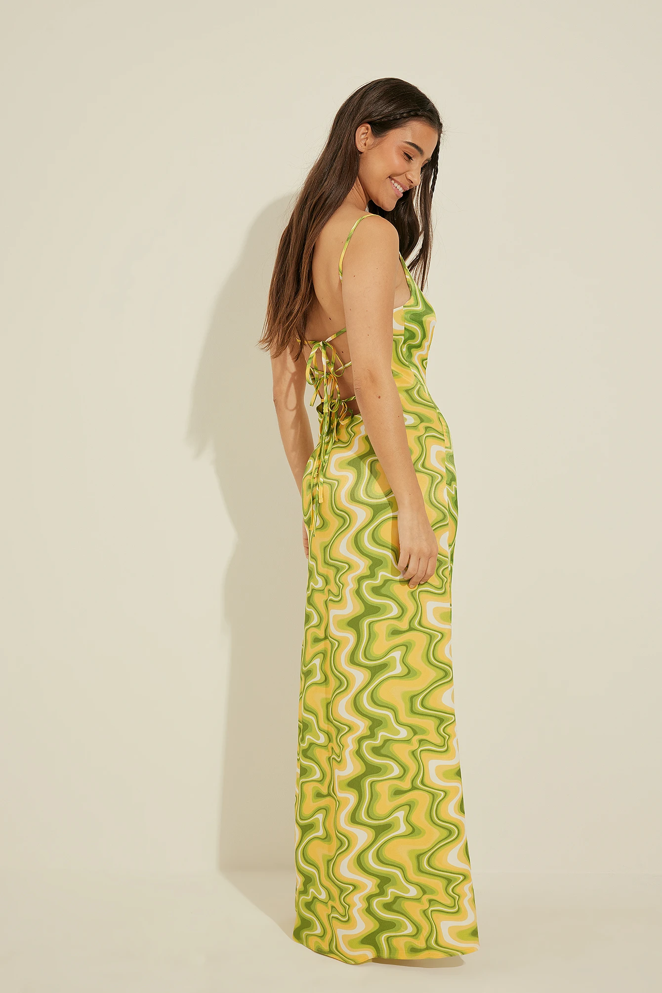 Cette robe longue est faite en satin et a des bretelles fines, réglables et croisées au bas du dos. Elle a une fermeture éclair latérale.