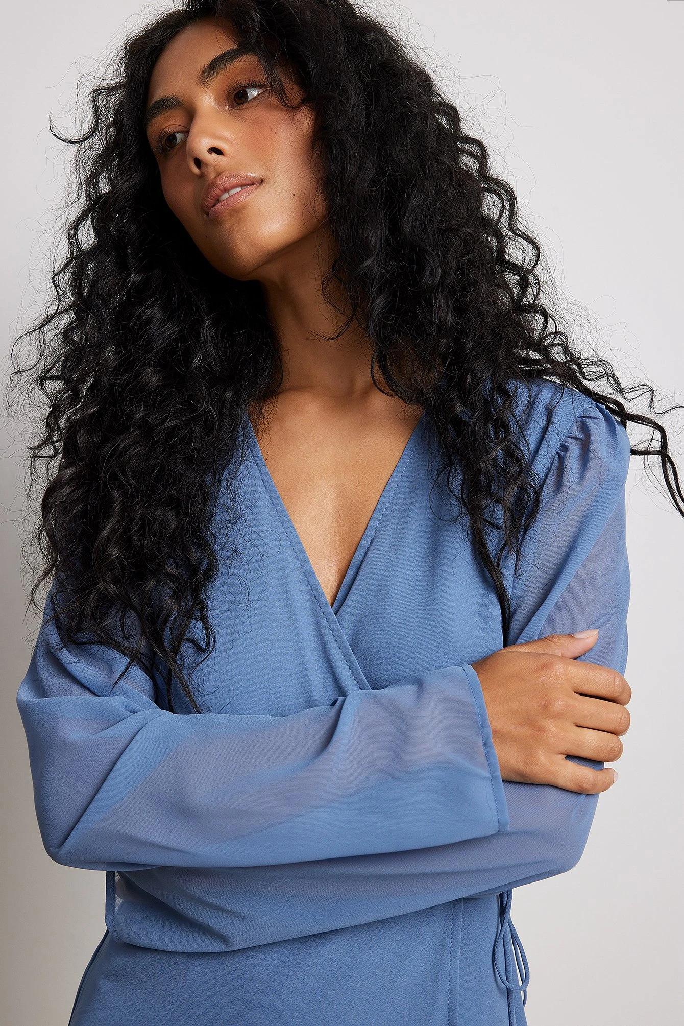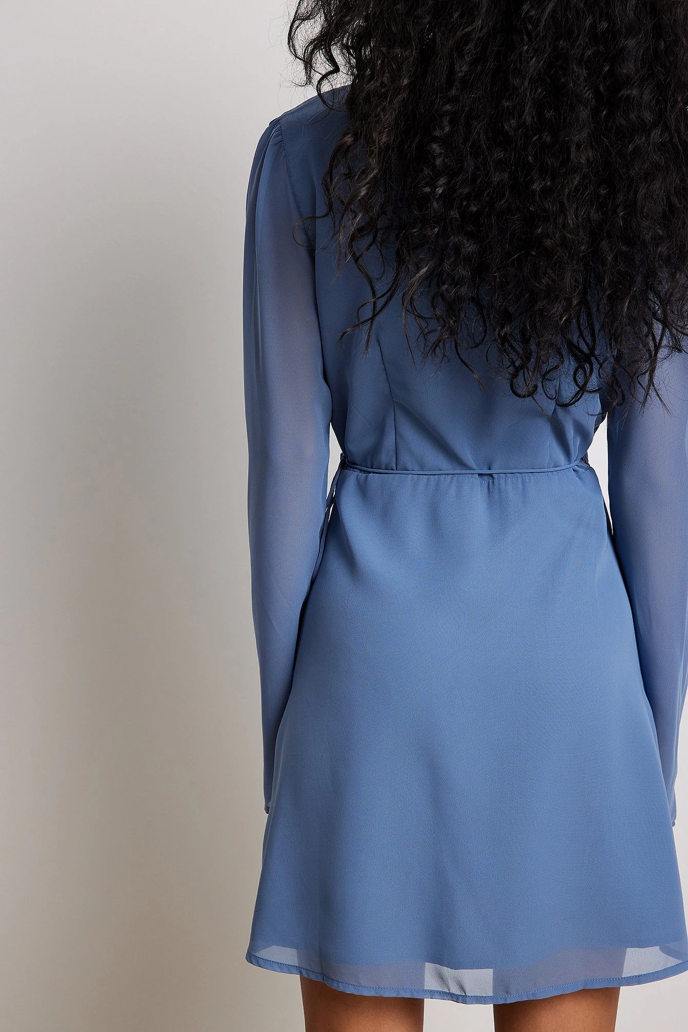 Cette robe courte a des manches longues, un design enveloppant avec col en V et détail auto-sérré et une coupe fluide.