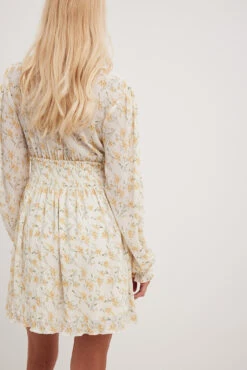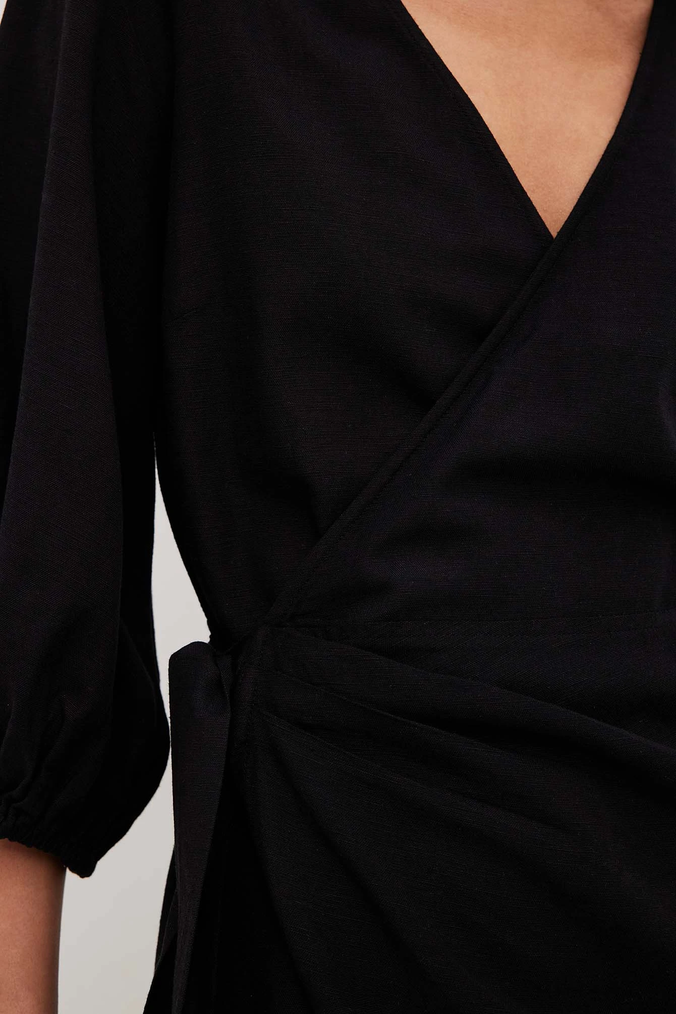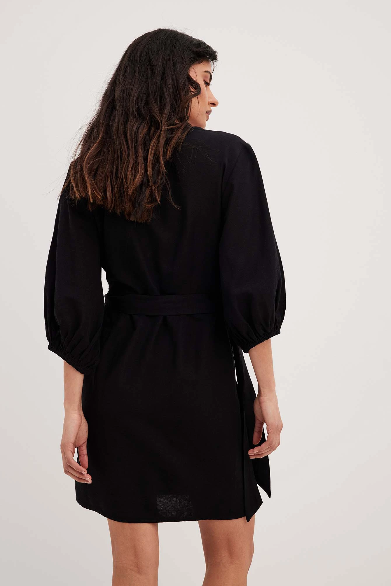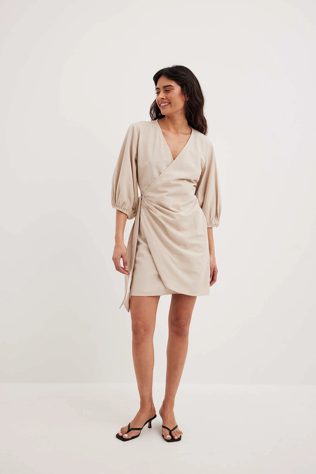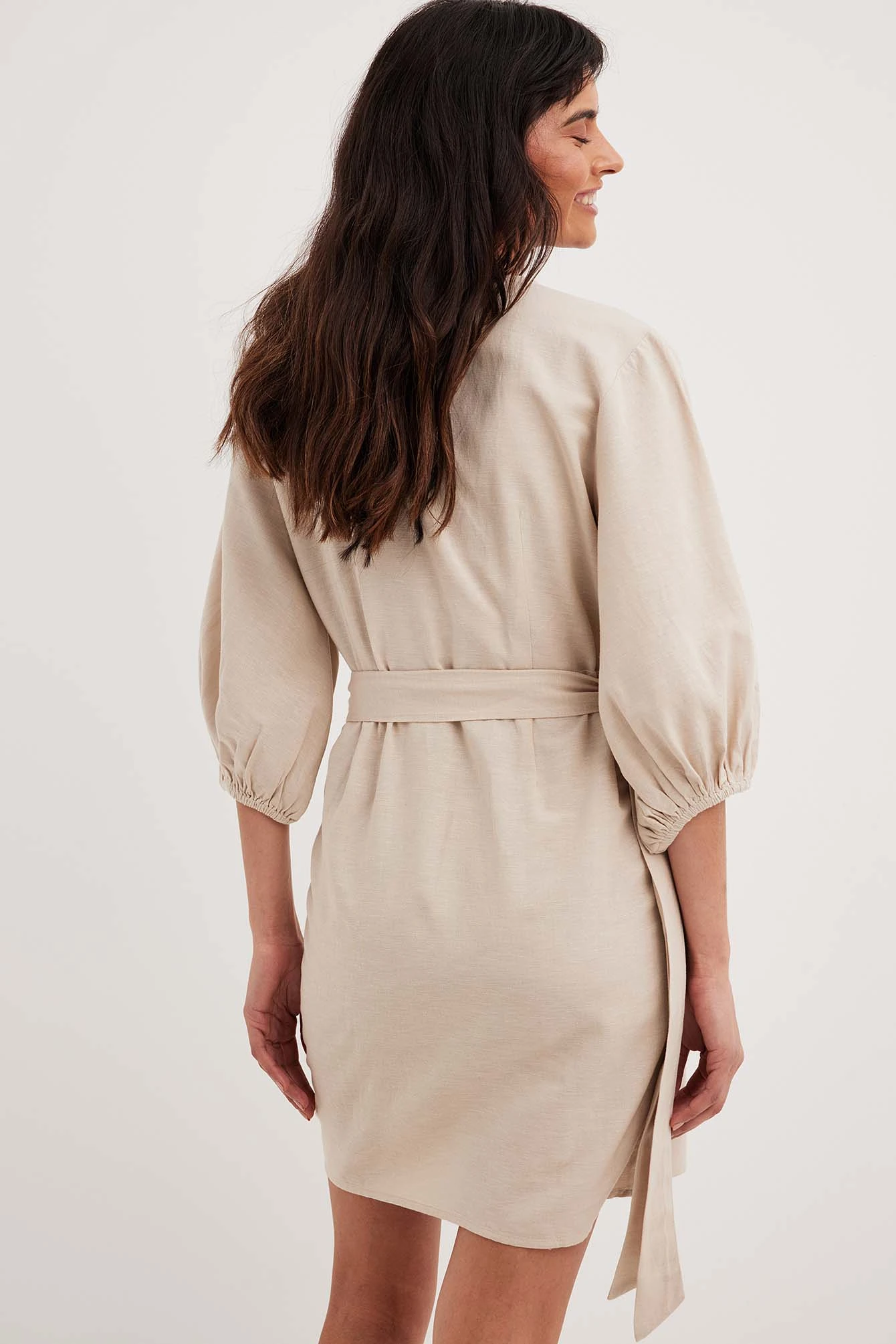 Cette robe courte a un mélange de lin. Elle a un design enveloppant et un col en V. Cette robe courte a des demi-manches avec manteau duveté et une ceinture.