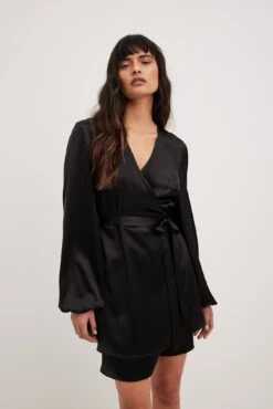 Cette robe en satin est fluide et a du toucher soyeux. Elle a un col en V avec design chevauchant et des manches longues avec manchettes élastiques. Cette robe en satin a une couche et une ceinture élastique avec fermeture ajustable réglable.