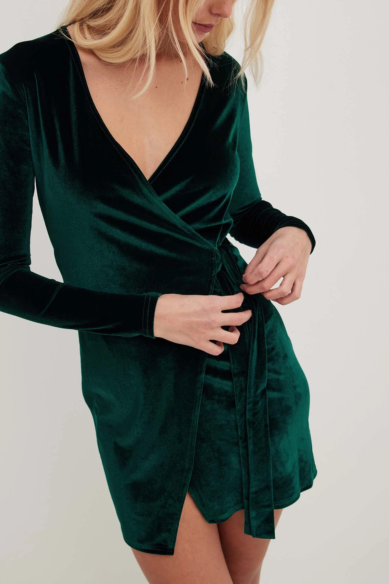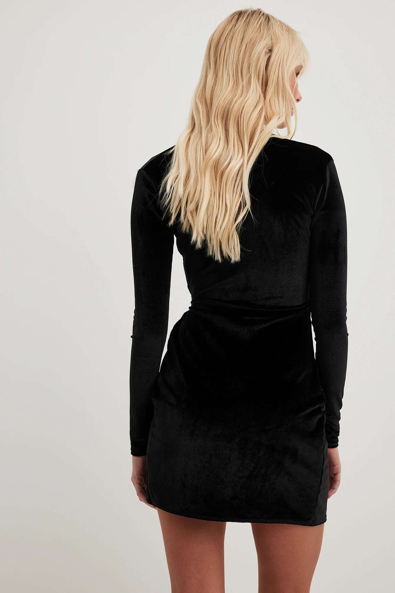 Cette robe courte a un toucher velouté. Elle a un design enveloppant avec fermeture ajustable avec braguette à boutons cachée et col en V et des manches longues.