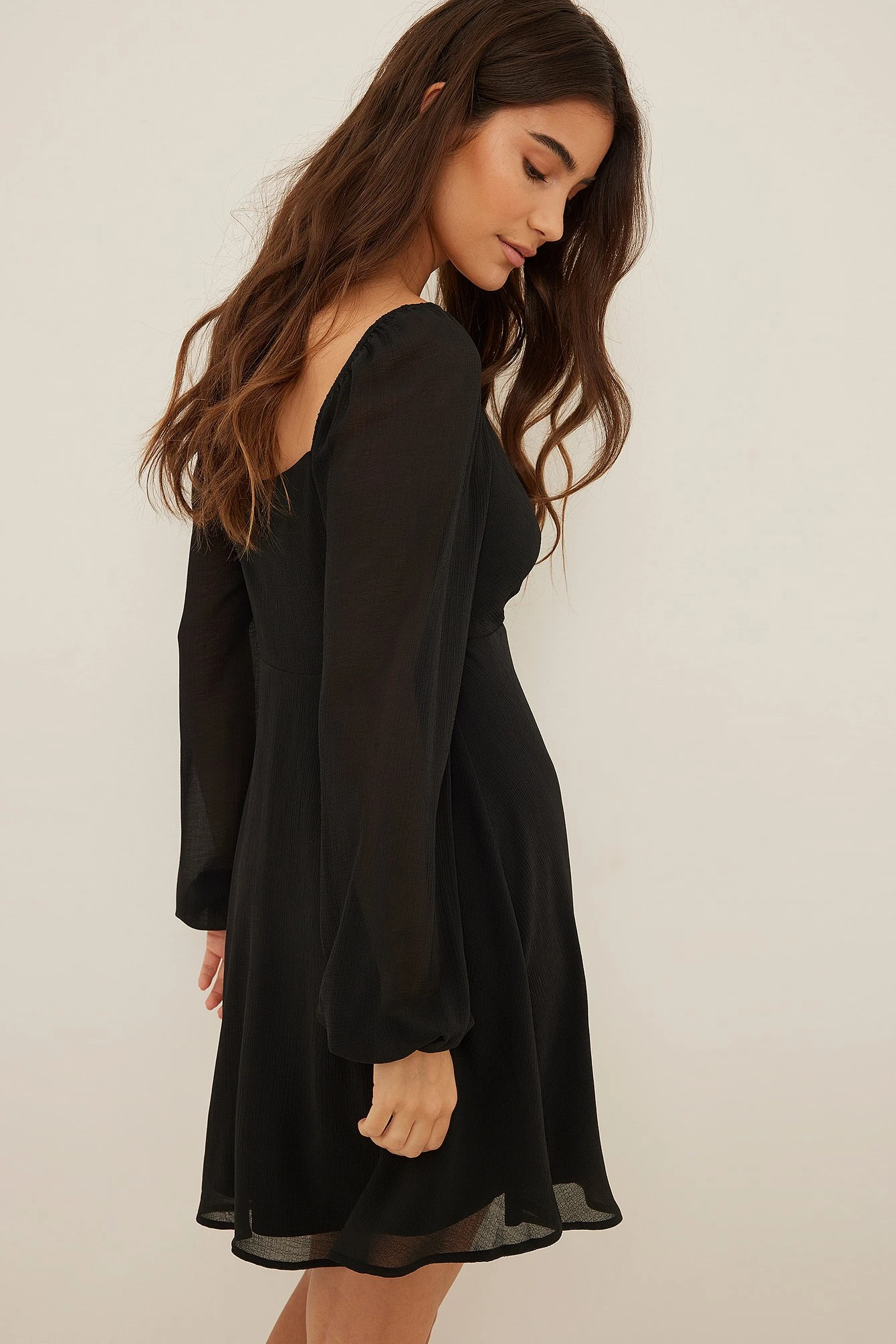Cette robe a des manches longues, une taille courte, un détail enveloppé à l’avant, une matière fluide, un décolleté en coeur et une coupe ample à l’arrière.