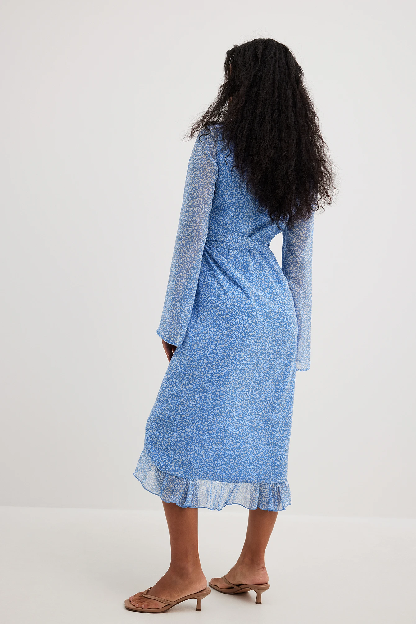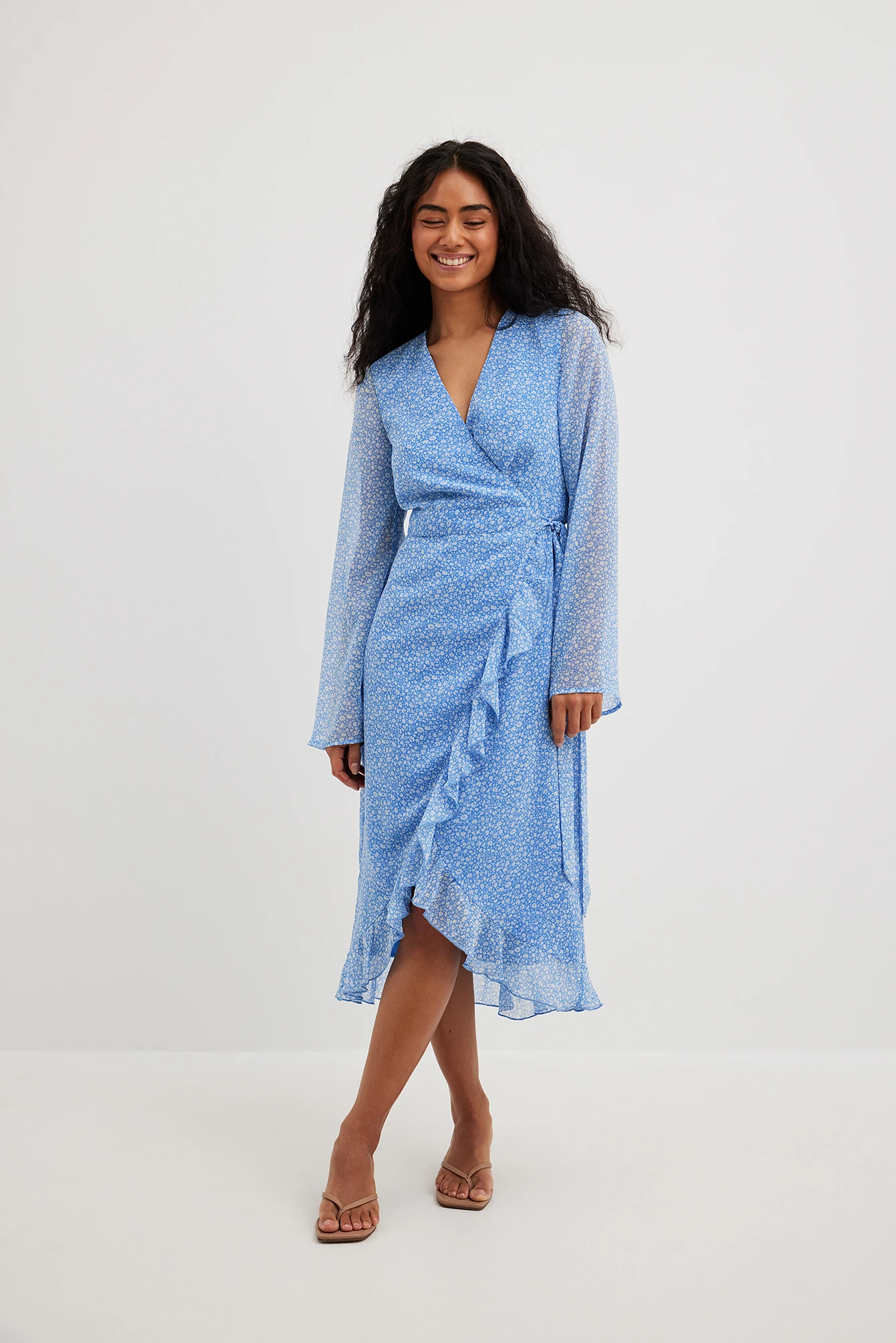 Cette robe a un design de fleur. Elle a une robe portefeuille et des designs à longues manches. Cette robe a un détail froissé et une doublure.