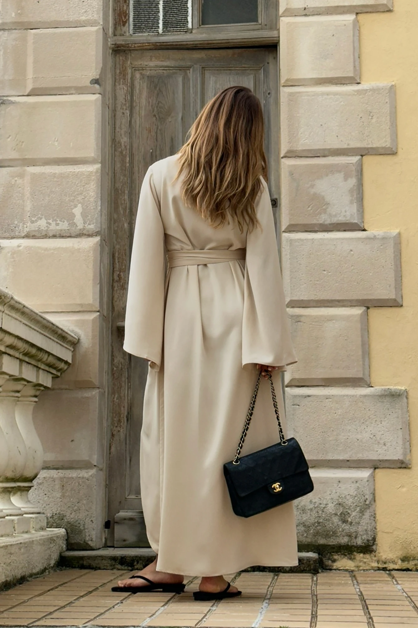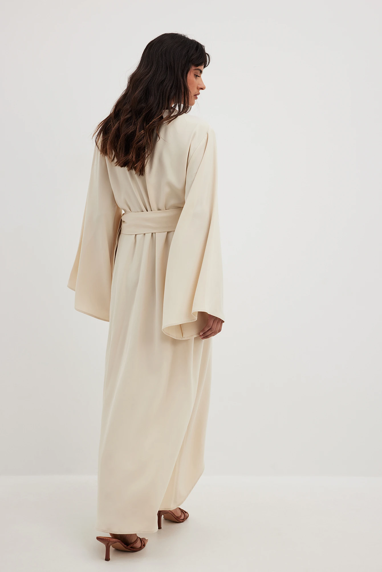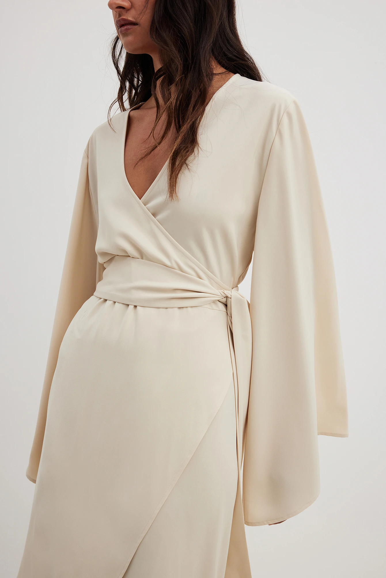 Cette robe midi a une coupe fluide. Elle a un col en V et des manches longues larges. Cette robe midi a un design chevauchant et une ceinture ajustable.