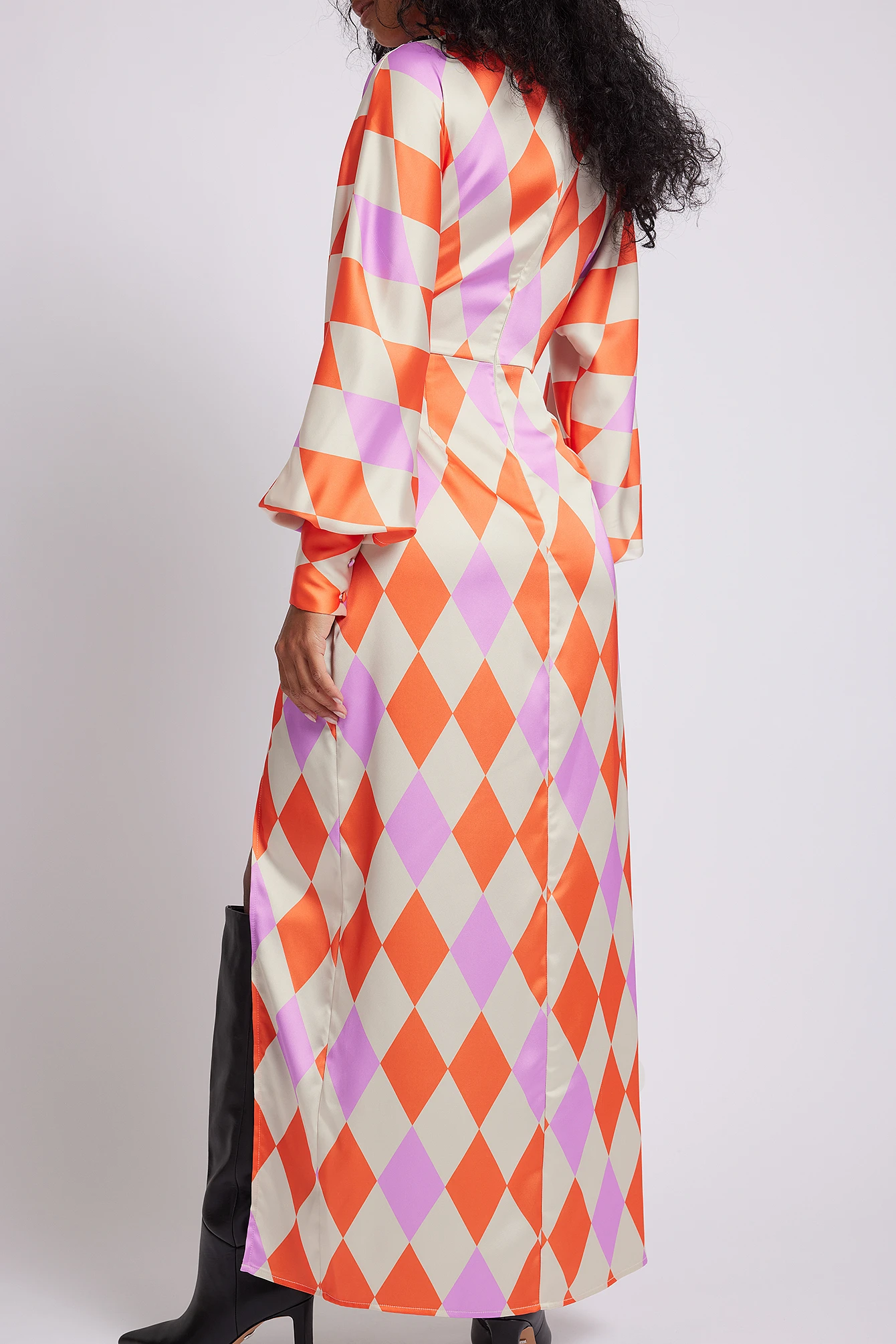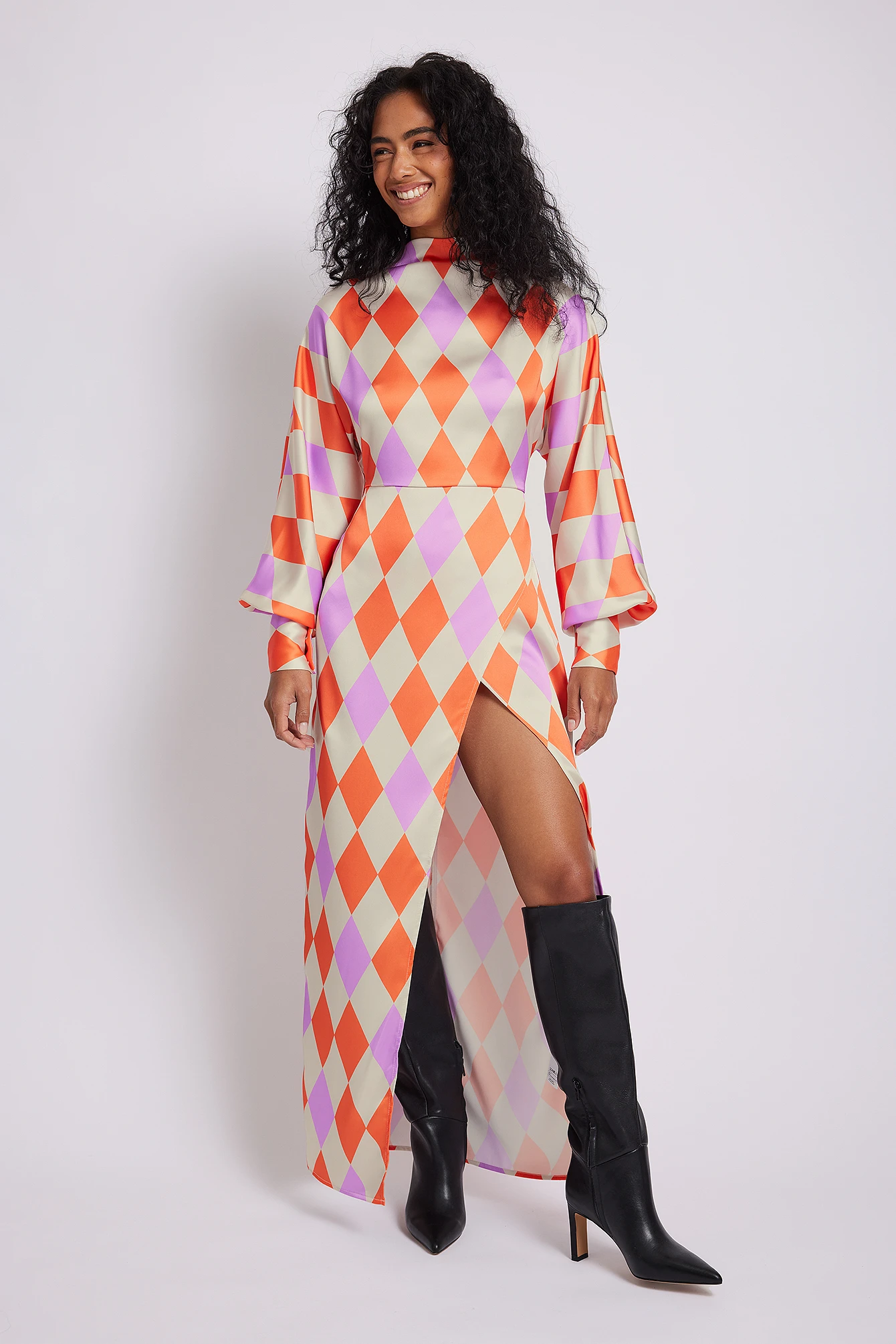 Cette robe longue a un col haut, des manches longues avec manchette à trois boutons, une fermeture au dos et une longue fente avec design chevauchant.