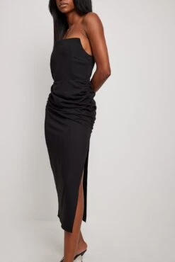 Cette robe midi est sans bretelles et a un design corset sur le haut, une fermeture éclair sur le côté et une jupe ajustée avec coutures froncées sur les côtés et fente latérale.