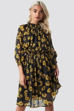 Cette robe midi par NA-KD Boho a un col haut élastique à volants, une ceinture élastique, des manches longues et une coupe ample.