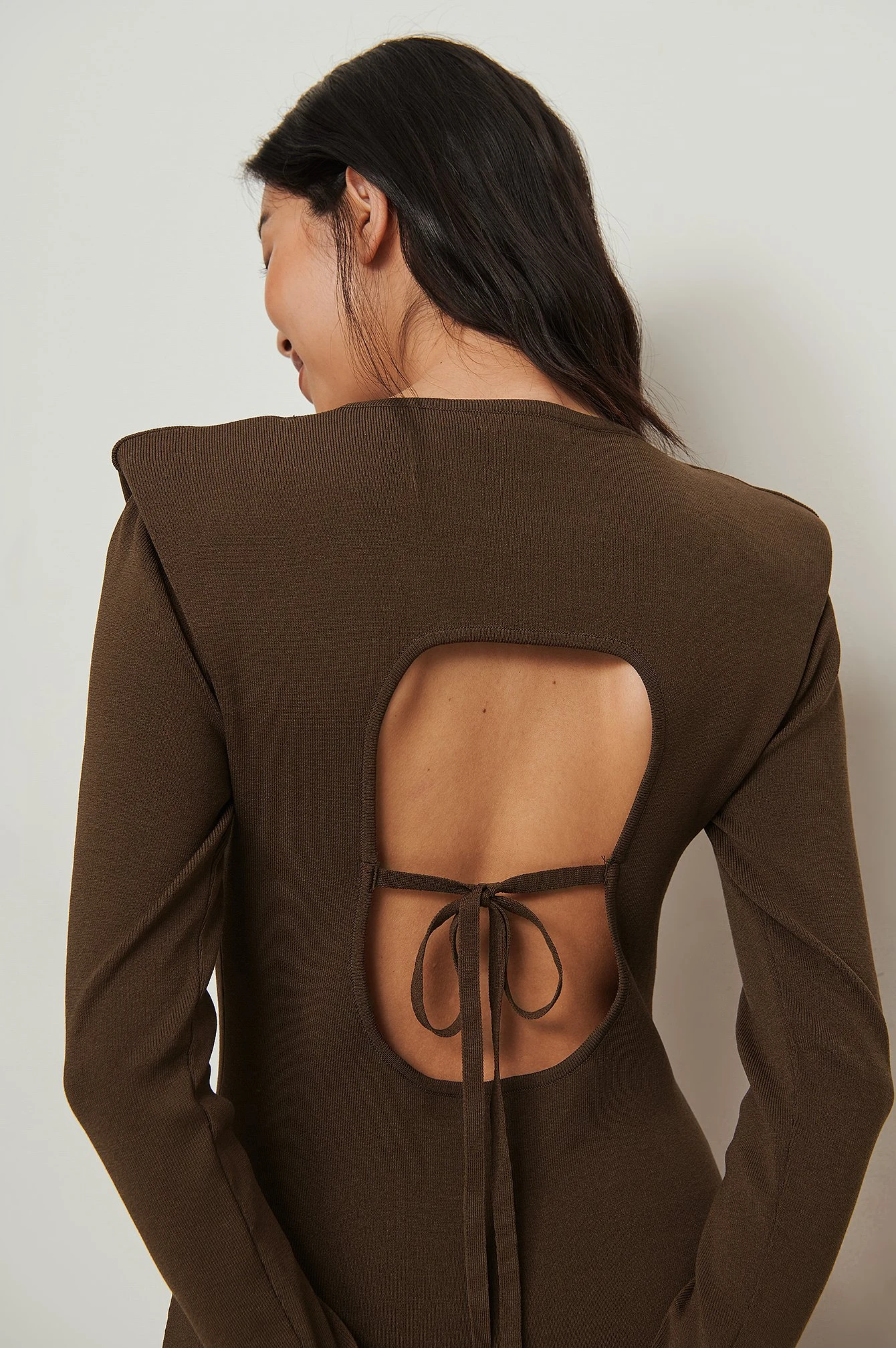 Cette robe est tricotée et a un col arrondi, des épaules rembourrées, un design à dos ouvert avec cordon ajustable et une coupe moulante.