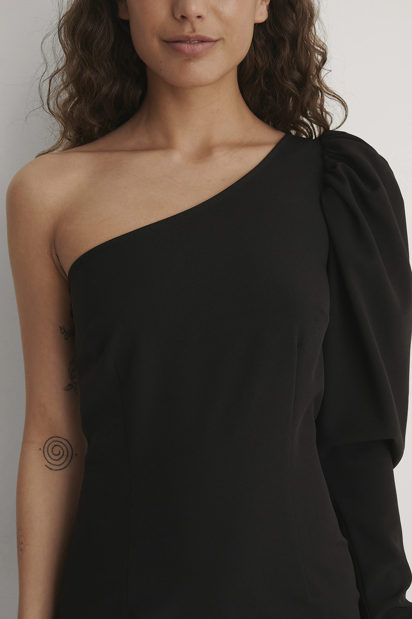 Cette robe a un design à une épaule bouffant, une manche longue, une fermeture éclair latérale, une coupe slim et une taille courte.