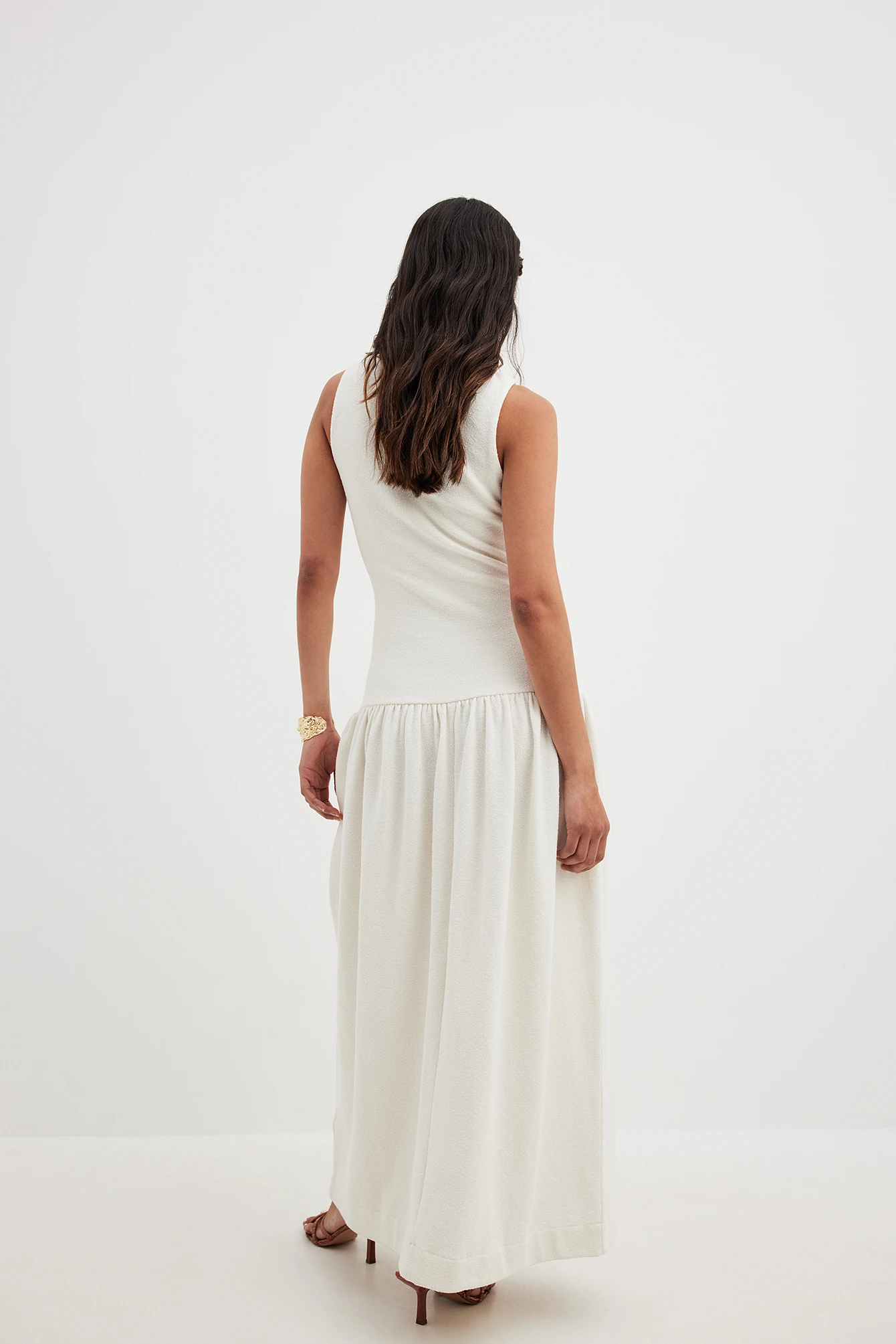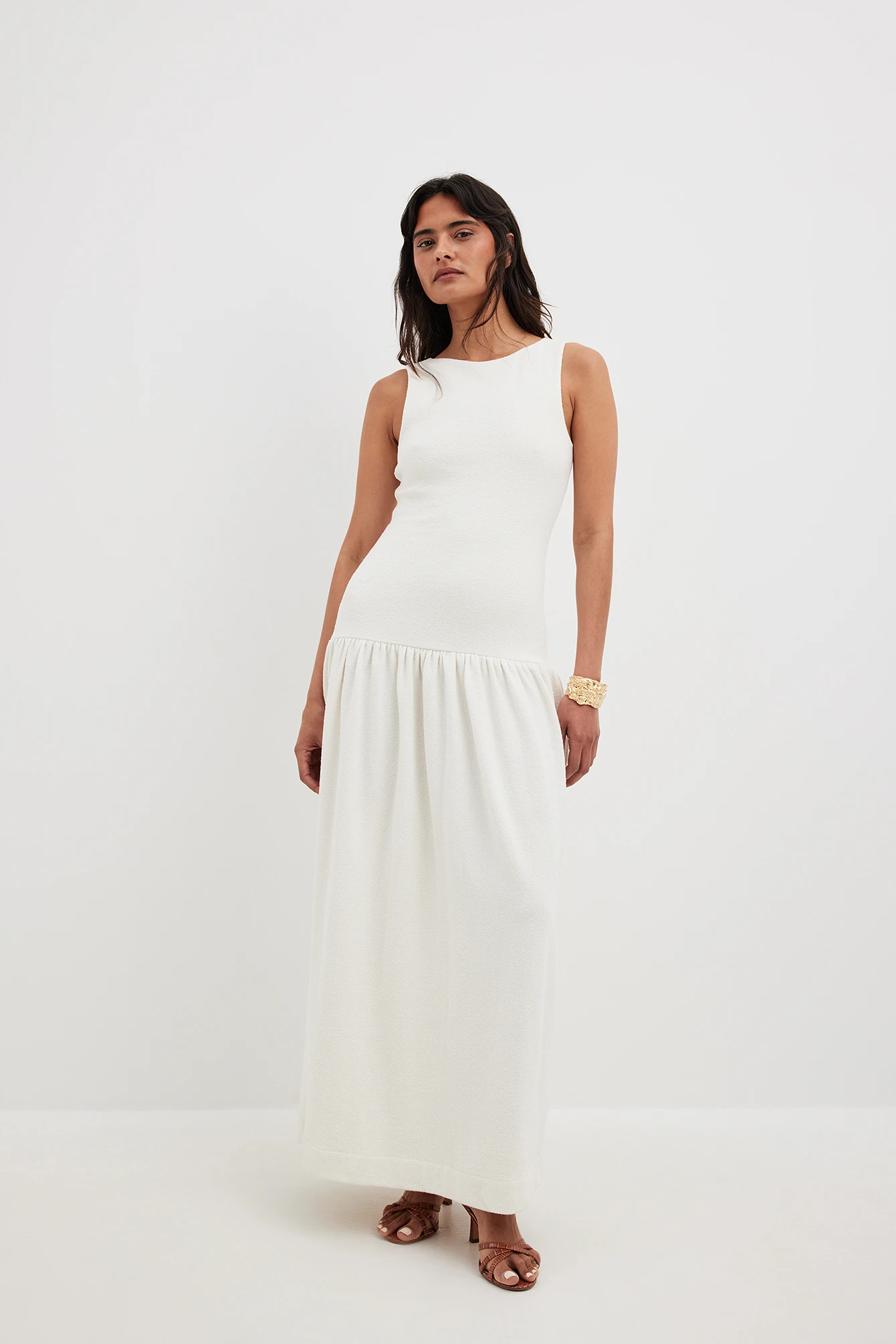 Cette robe longue a un col haut arrondi. Elle a un toucher texturé et une doublure. Cette robe longue a une coupe moulante et une jupe coupe ballon.
